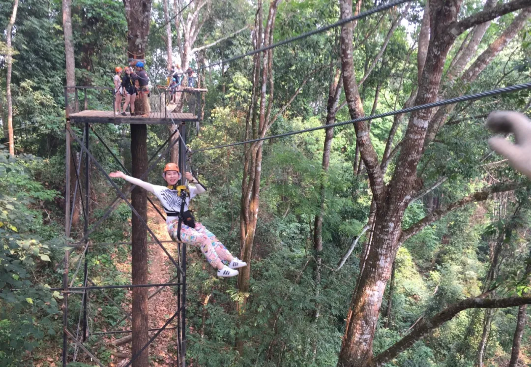 然后那个丛林飞跃,这个我觉得还挺值得去的,虽然贵了点。我订的是那个什么丛林飞跃公司,名字太长了记不住,一个人一千多泰铢吧,包接送包午餐,早上八点多来酒店接,开了差不多一个小时才到。说实话刚开始我是有点怕的,那个绳子看着挺细的,心里想着会不会不安全,但是教练一直在旁边保护,而且装备检查得很仔细,慢慢就不怕了。最长的那条索道真的超刺激,在树林上面飞过去,下面就是一片绿色,感觉特别爽,就是玩完以后腿有点软,可能是太紧张了