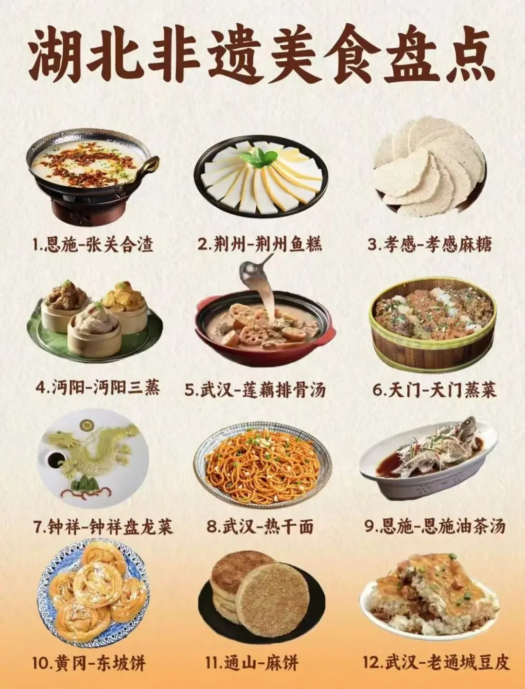 过早:热干面(蔡林记/老汉口)、三鲜豆皮(必点)、面窝、糊汤粉。