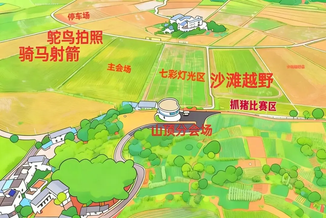 整个场地大致分为了鸵鸟观赏拍照区、骑马射箭区、主会场、七彩灯光区、沙滩越野区、抓猪(鸡、鸭)比赛区、山顶分会场、停车场等几个大致板块。
