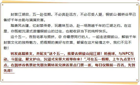 ✅转发推文福利:转发景区下面这篇推文到朋友圈,并写上“这个五一,我要去铜钹山闯江湖!抢绣球、玩NPC、斗匪寇、聚义护山,沉浸式实景大戏等你来!”,在五一期间可免费入园,(5月1日至5月5日)每日限100名,先到先得!
