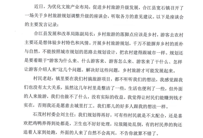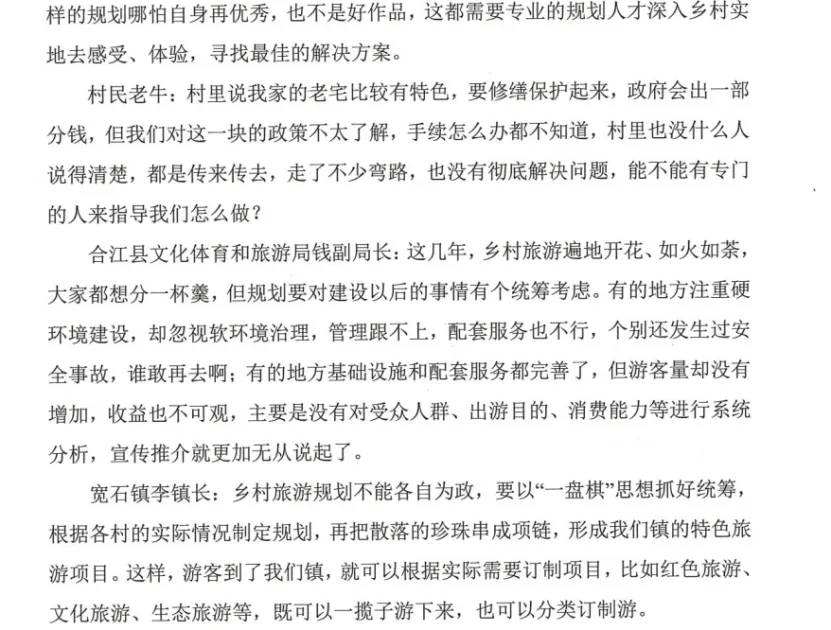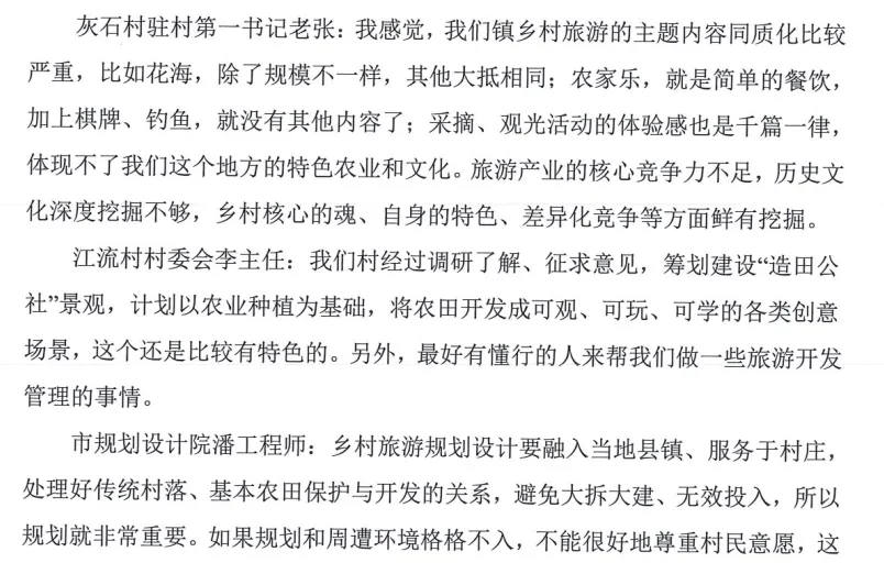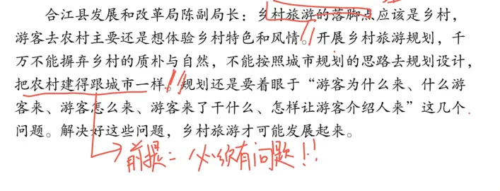 同理:市级层面的专家发言——表述了乡村旅游规划设计的原则理念,正说反说,最后指出需求(专业人才)。——貌似可以作为建议,但是仔细看,1.有具体到是宽石镇吗?【主体不明确】2.有提到是宽石镇存在规划设计方面的问题吗?【问题不聚焦】——都是NO,所以这一点是干扰信息,对于宽石镇来说就是无效建议。