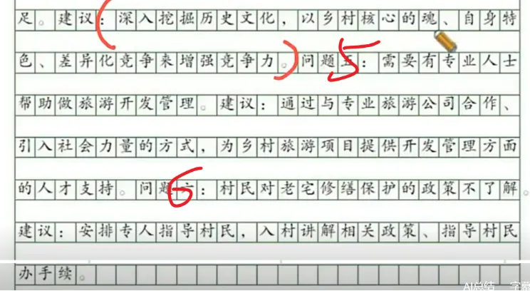建议:1.(规划时以村民大会的形式征求意见,合理吸纳)听取村民意见,对当地村民提供工作岗位,帮助村民在乡村旅游建设中营收。2.加强宣传引导,【让村民了解规划内容,积极配合工作】提升村民环境卫生保护意识,开展村居环境整治专项行动,对家禽和狗的活动范围进行约束【太细节了,只需要点出让村民配合即可,不用深入】。3.提升各地区旅游产业的核心竞争力,挖掘历史文化深度,体现乡村核心的魂、自身特色、差异化竞争。4.引入专业人才进行乡村旅游开发管理,深入乡村实地体验,寻找规划设计的解决方案。政府要配备人员指导村民开展老宅修缮保护相关政策和手续办理。5.乡村旅游规划要以“一盘棋”思想抓好统筹,根据各村的实际情况制定规划,再把散落的珍珠串成项链,形成特色旅游项目。【解决旅游主题同质化严重(=要有特色)的建议,注意到有用但是没针对问题一对一】