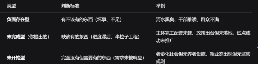 未完成型差距:现状处于半途(如工程主体完工但配套未建)→ 目标(全面建成投用)。这种“未完成”同样是差距,因此同样是问题。