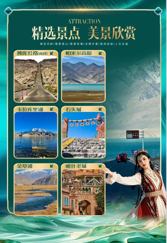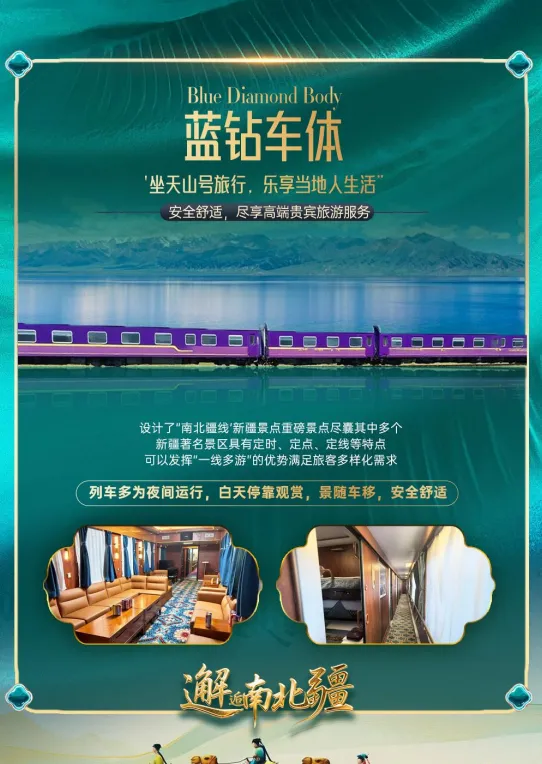 路线亮点:全程纯玩无购物,一价全含,适老化与高原适配双重加持;串联喀什、塔县,解锁南疆人文、高原盛景与民俗风情三重体验;专列配置完善,践行“天山雪莲”服务理念,配备随车医护、制氧设备及专属管家,全程高原防护护航;行程舒缓,控制单日车程,增设高原适应时间,提前预约景点讲解及接驳,避免旺季排队,预售期间可享优惠,主打“昼游夜行”模式,保障休息质量,贴合老年群体体力与作息。
