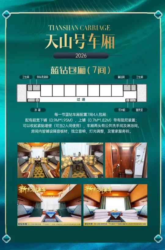 本次天山号老年文化专列全程纯玩无购物、一价全含,全列升级高端适老化配置,践行“天山雪莲”服务品牌理念,采用酒店式包房设计,配备独立干湿分离卫浴、防滑地板、扶手、放大标识及应急呼叫系统,全列卧铺布局,床垫选用高回弹材质,设有高级软卧双人间、普通软卧四人间等多种房型,配备随车医护、银发专属管家、专业导游及养生厨师,主打“慢游南疆、文化沉浸、高原适配”模式,行程舒缓不赶路,控制单日车程,增设高原适应时间,适配银发群体节奏,具体路线如下: