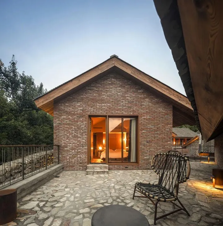 瓦厂酒店(三卅营地)是集群中的标志性项目,其前身为废弃瓦厂,改造过程中保留了工业遗迹的粗犷质感,如红砖墙与高耸的厂房结构,同时融入现代设计元素,露天泳池与美术馆的加入更添艺术气息。民宿内部以暖黄色灯光营造温馨氛围,透过大玻璃推拉门可直视庭院内由石块铺就的自然地面与藤编座椅,形成室内外空间的有机融合19。