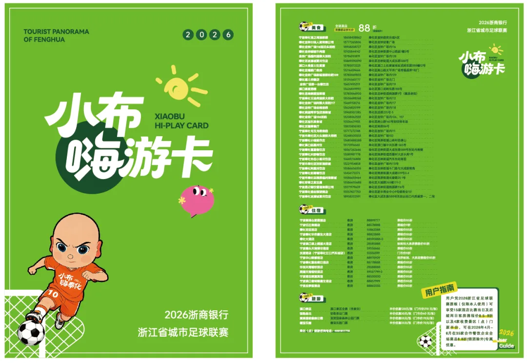 除了攻略图,另一实物载体“小布嗨游卡”已面向2026浙商银行浙江省城市足球联赛奉化主场的观众试点发放,持卡可在指定酒店、景区、餐饮商户享受专属折扣。
