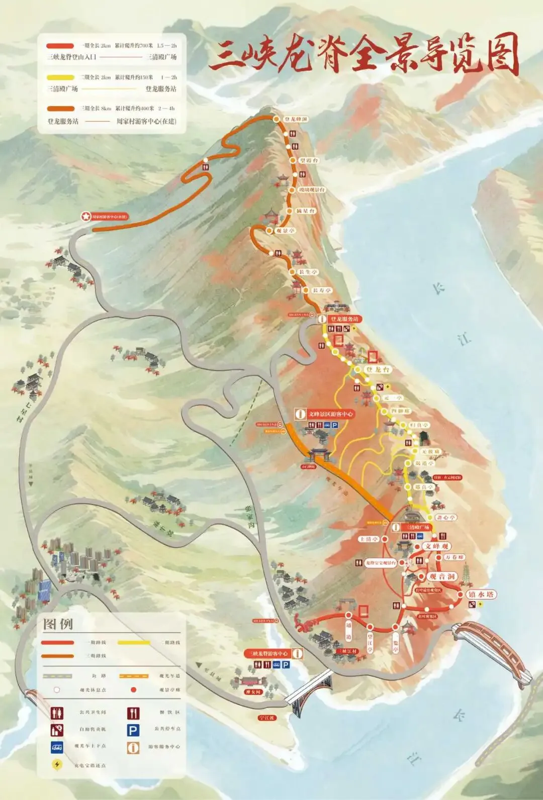- 玩法1:户外或徒步爱好者导航到”三峡龙脊游客中心或三峡龙脊徒步起点,累计爬升约1200左右,全程约12公里,约5-7小时.