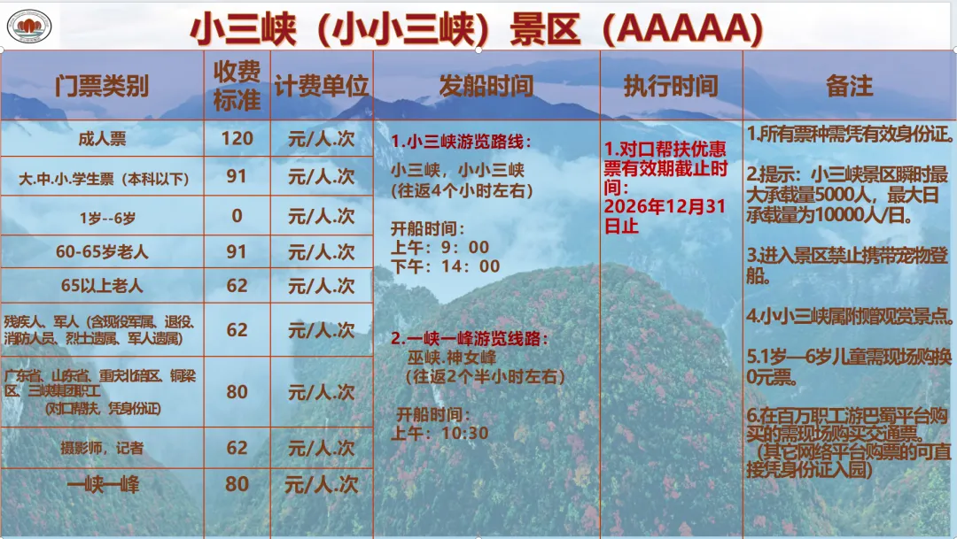 - 门票:120元(成人票)含大船+小小三峡小船(网购提前订,刷身份证更快)。