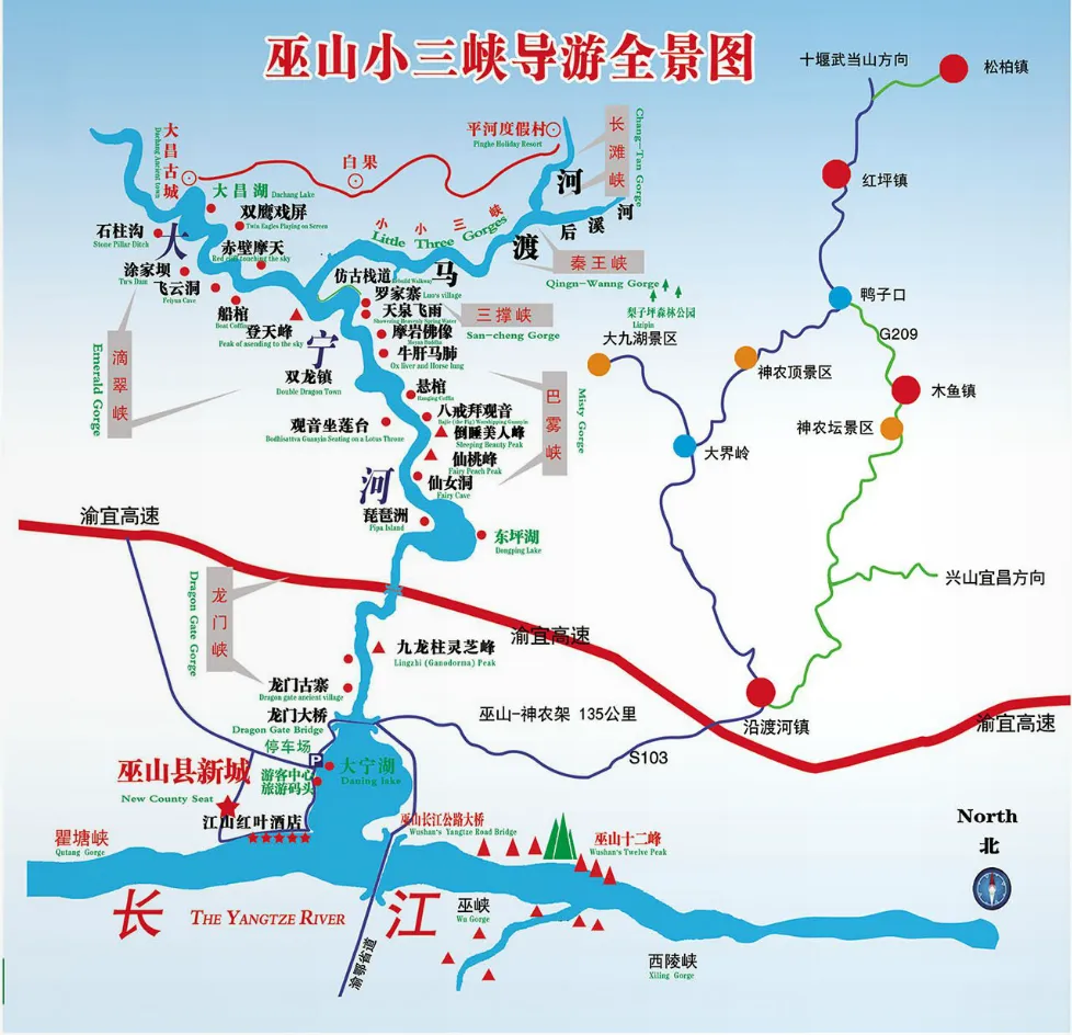 - 玩法:县城大宁河口乘船逆水而上,依次游三峡,再原路返回,全程约4小时;滴翠峡可换乘柳叶舟/乌篷船游小小三峡。