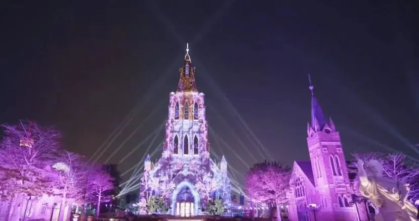 占地12万㎡,9座主题教堂。2025年新增"星空礼堂",夜晚穹顶投影银河,求婚/拍照圣地!