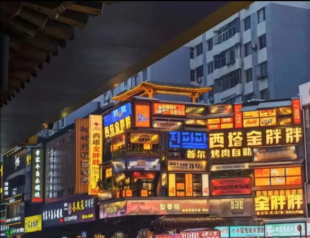 沈阳“小韩国”,满街韩货店、烤肉店、打糕铺。推荐浦项烤肉、金利来冷面,人均60元,夜景超出片。