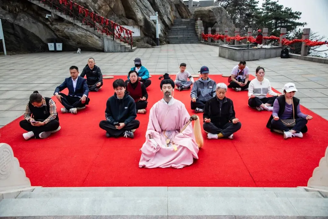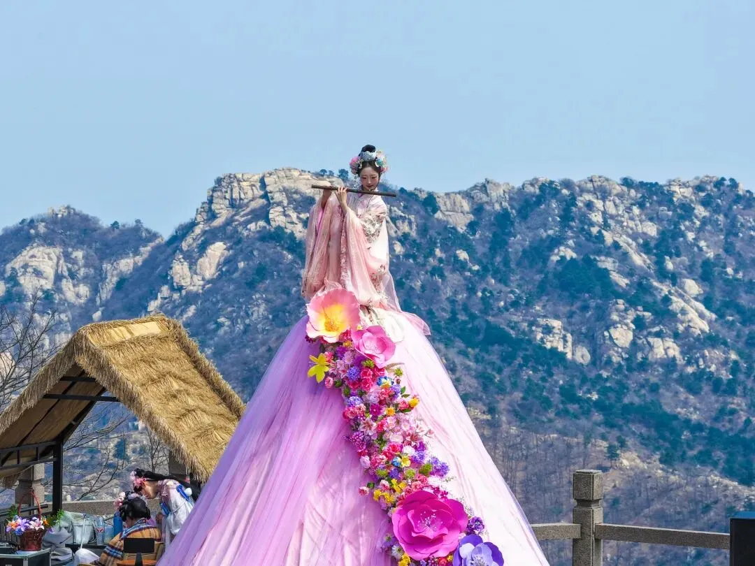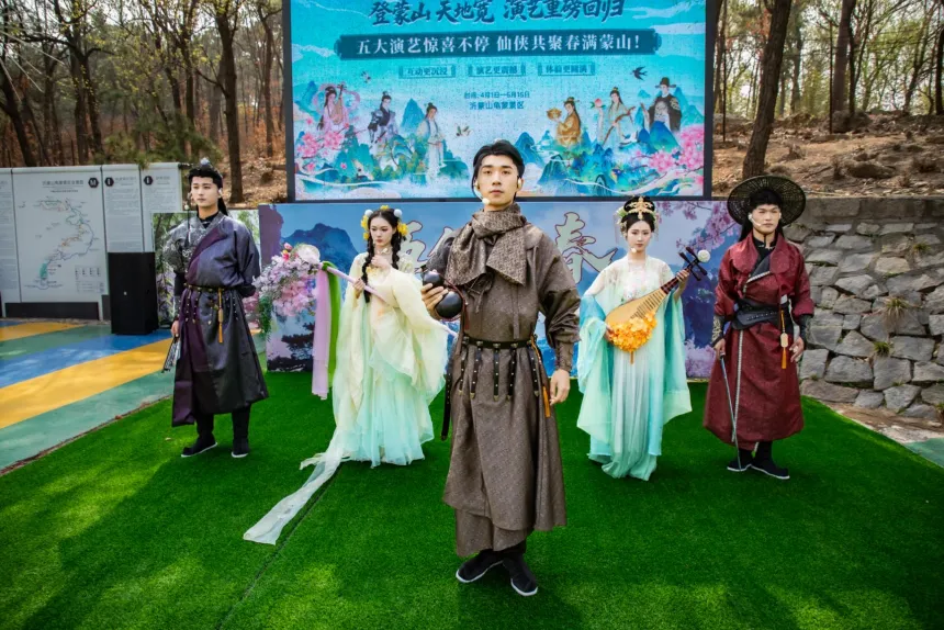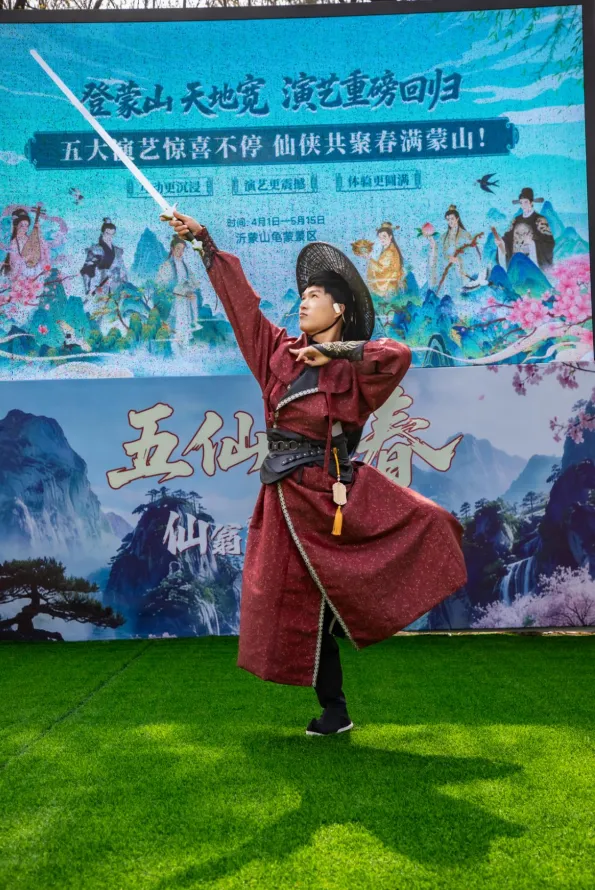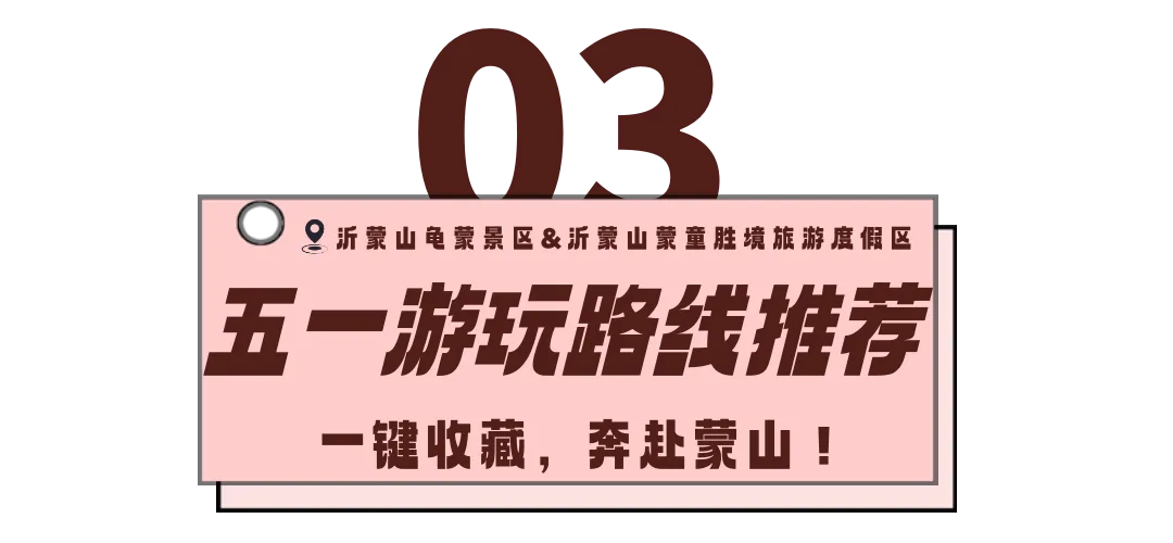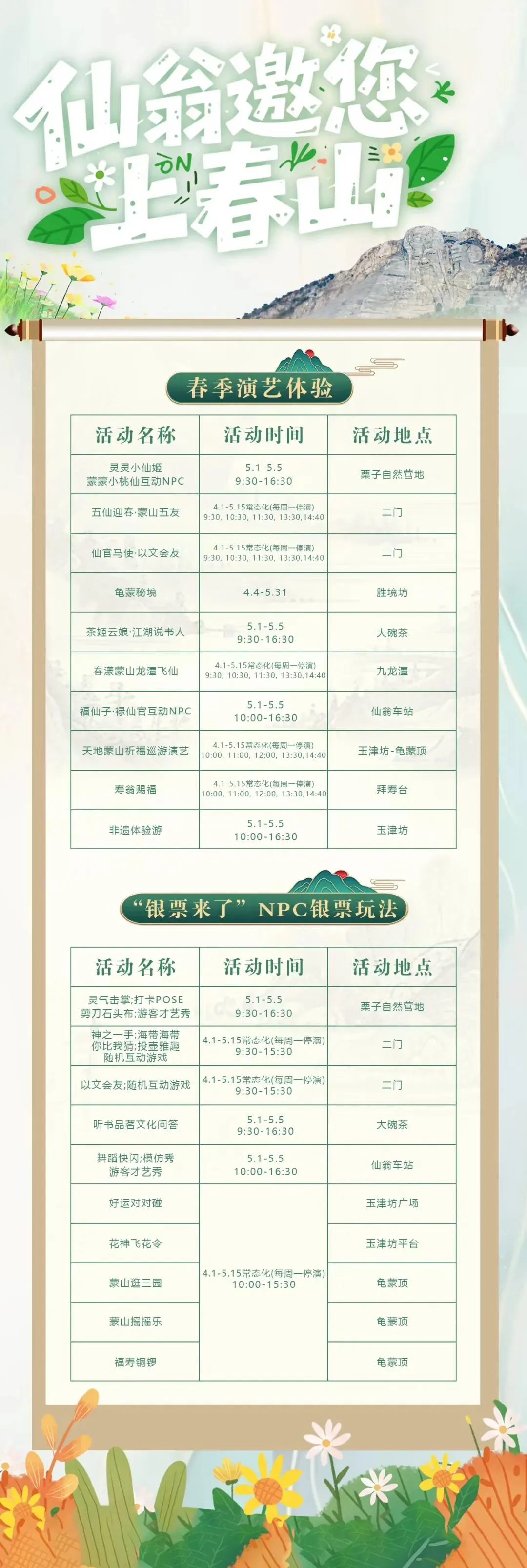 龟蒙景区二门(五仙迎宾、仙官马使)→ 九龙潭(春漾蒙山龙潭飞仙)→ 蒙山悬崖栈道(打卡拍照)→ 龟蒙顶(登顶观景、接福互动)→ 拜寿台(观蒙山仙翁山体雕刻)→ 下山直奔蒙童胜境(美食+夜游)