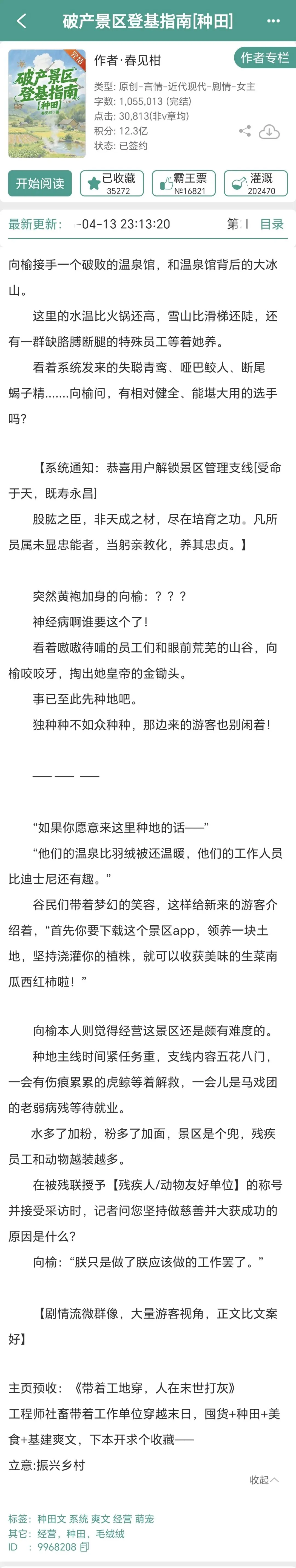 这本书是现代带灵异元素和系统的无CP经营流种田文吧。 作者:春见柑,文笔挺好,人设我很喜欢,如果十分满分我可以给到十分满分! 总体评分: ★★★★★★★★★★ 故事梗概: 女主是个孤儿,大学的时候收养了一只猫(也就是男主),但后来出了车祸意外过世。男主是貔貅,掌管天地间的财气,为了救女主,并满足她的愿望(既想当皇帝,又不愿意放弃现代的便利生活),给女主量身定制了一个经营流系统。这个系统在女主所在城市圈了一个哈蟆山(其实是蛤蟆山,但因为众所周知的原因,晋江的蛤蟆是口口,所以作者写成哈蟆山,并不是错别字哦~),山里有温泉,系统完成了最初的修缮,让女主来经营。女主获得的满意度可以为她增加阳寿,而如果在她的景区有人死了,那她的阳寿就会减掉一半。 在其他界面,还有一些非人类会来女主这里度假,女主也需要招待他们。还会来一些人成为女主的工作人员。女主的大学离景点很近,她一开始就在大学里招了几个工作人员,其中一人的爸爸是城中喜来登酒店的老板,他从喜来登挖来了厨师,于是温泉开业。 接着男主也成为非人类的工作人员过来,刚好遇到人贩子在村子里偷小孩,女主因为系统发布的预警,用系统奖励的技能暴打人贩子,加上男主的辅助,被博主直播,发了出来,于是就开始火出圈。而且女主本来就不关心挣钱,她只想挣满意度来增加自己的阳寿,所以各种设施都超出预期,口碑也越来越好。 女主在给力的工作人员的辅助下,把整个景区经营得蒸蒸日上,变成了国际知名的景区,最后he了的故事。 看点: 你敢信吗这是这个作者的第一本书!我之前书荒了很久,然后在完结榜翻到这本书,就看了一下。其实这本书的第一章不是很吸引我,但它的评分实在是很高,于是我就看了下去。结果两天就看完了,迫不及待地来给你们推荐。这本书真的超好看,我看完了之后进入作者专栏去看了一下,发现除了这本书之外居然只有一本预收,不要命了第一本书就写得这么好! 先来说一下这本书好的方面,首先文章的设定和女主的性格我都很喜欢,之前说过我是很喜欢种田文的,而这篇种田文又汇集了我喜欢的各种因素,是经营类的种田文,女主有系统,有非人类的工作人员的助力等,我就更爱看了。其次女主的性格也塑造得很好,她是那种很清醒的人,挺宽容的,很多小事不会放在心上,但她也不是圣母,甚至有点睚眦必报,对自己讨厌的人会选择重拳出击,反正我是很喜欢的。 其次作者的脑洞真的很大。这本书是经营流,而且是从无到有的去经营,但是作者写的各种经营的方式给人感觉是虽然天马行空,但又是可能发生的,而且很有想象力!比如景区的APP,动画是怎么样的,怎么玩,怎么有积分,都写得超级活灵活现,我看了都会想如果真的有这么个APP,我肯定也会去下载的。还有景区的每个部分,比如爬宠动物园,4d电影等,都写得很好,又符合逻辑又吸引人。 这篇文还写到很多大型活动,什么大型的剧本杀,丰收节,秦王破阵乐等等,不但很有想法,而且还都写得很好,有详有略,景色描写也很生动! 这篇文还超有梗的,老梗新梗都很自然地融入文中,很多地方都写得超搞笑。推荐大家看段评,也很有趣! 缺点呢也有,首先就是这本书怎么能归到言情里呢?虽然男主是男主,但是他估计也就占了百分之一的笔墨吧,感情呢也是没有的,连一个Kiss也没有哦!想看谈恋爱的可以放弃这本书了,对于我来说这本书就是无CP的文哈。放言情可能只是说明了女主的性取向。 第二就是有些配角后面就没有交代了,比如得了厌食症,在女主的农场买了菜之后又能吃得下了的女主首批客户的女儿,写到能吃下东西后面就没有了。比如在女主的雷区蹦跶,企图在景点玩翼装飞行的人,差点死在景区害女主的阳寿被扣光,后面被女主救了又让她们破产之后也没有再写到了。就有些配角还是很希望知道她们的结局的。 第三就是反派不是很能打。应该说这篇文就没什么反派,零星几个,都只是对女主造成刮痧一样的伤害,也没有那种贯穿全文的大反派。不过鉴于这是一篇种田文,所以也不出奇。不过我感觉有反派的话会更狗血好看! 全文一百万字,算是比较长的,但是看的话一点都不会觉得长,还会觉得看得太快了,看完了可咋办哈哈哈,真的很好看哦,要知道我很少打十分的,更何况是给一个新作者打十分,真的非常少见!强烈安利给你们! 我是完结之后看的,属于我会熬夜看的文,强烈推荐!