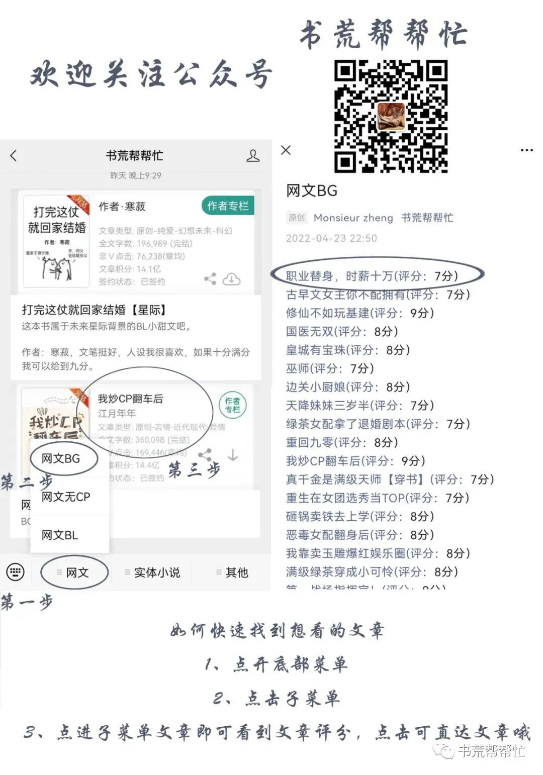 欢迎关注我的公众号: 我的评分标准: 10分★★★★★★★★★★:我觉得写的非常好,作者文风非常对我的胃口,会想着熬夜赶快看完,甚至会N刷,看完之后会收藏作者,还会把作者的其他文都全部看一遍的文。 9分★★★★★★★★★☆:我觉得写的很好,也会想着熬夜赶快看完,看完之后也会看一下作者的其他文,但是不会想着收藏作者。 8分★★★★★★★★☆☆:我觉得写的挺好,文笔流畅,会想快点看完,但是不会熬夜,看完之后不会刷作者其他文。 7分★★★★★★★☆☆☆:我觉得写的算好,但是没有那么抓人,看书的时候可以随时停下来干点别的再回来看,没有那么强烈的赶紧看完的欲望。但是会把这本书全部看完。 6分★★★★★★☆☆☆☆:我点进去看是因为觉得文案写的不错,可能文笔也还可以,能支撑着看下去,但是可能看到一大半就没什么看下去的欲望了,会留着,时不时的回去看看,文荒的时候会把它看完。 6分以下的文不会出现在这里。