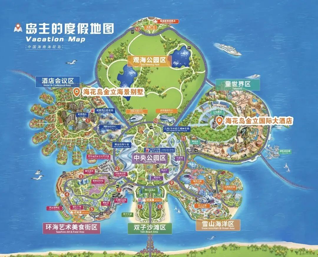 海花岛由三个独立的岛屿组成,1号岛是核心游玩区,2号岛和3号岛以住宿和生活配套为主。