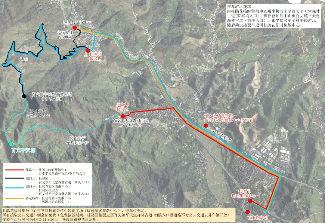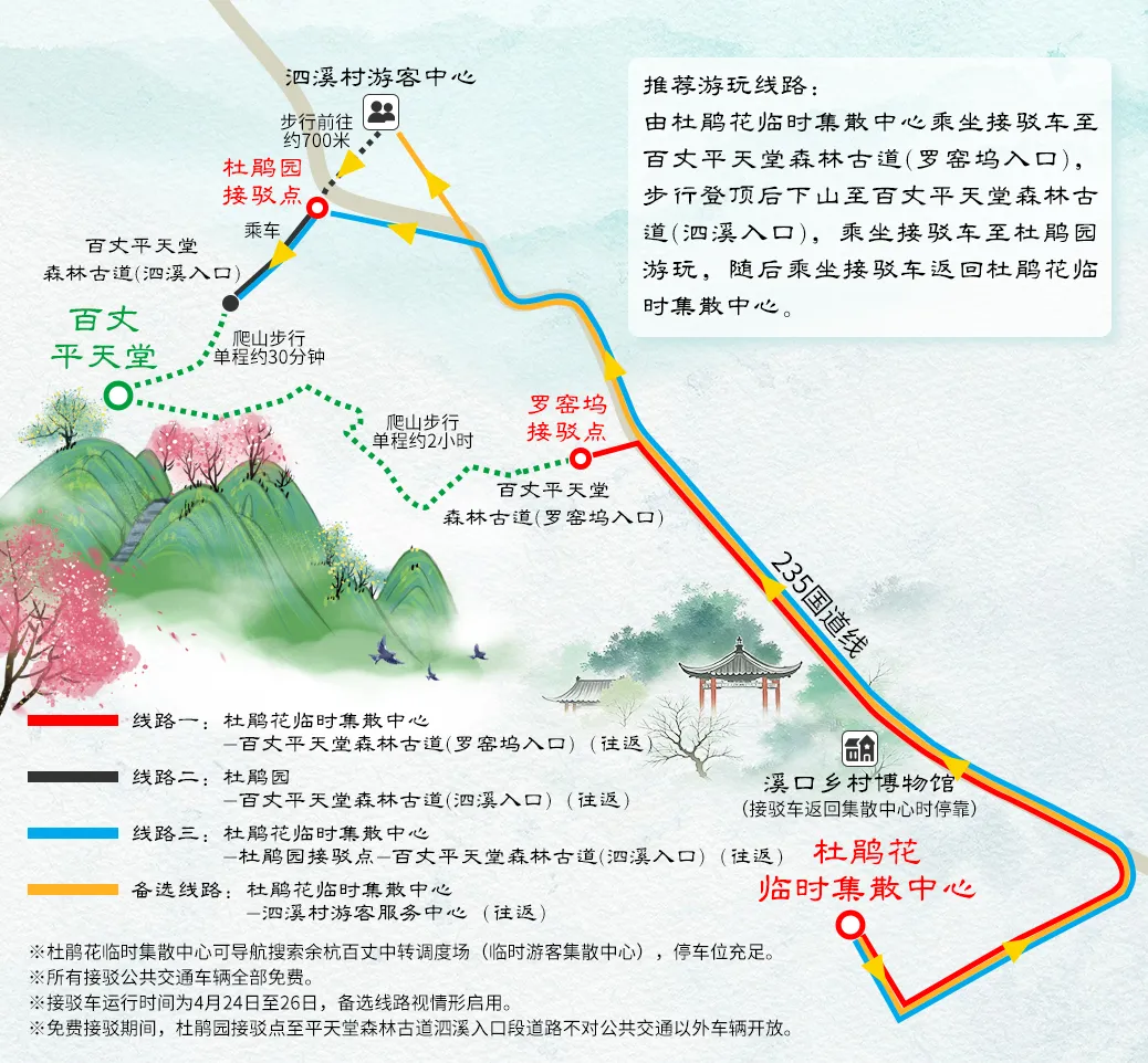 温馨提示:免费接驳期间,杜鹃园接驳点至平天堂森林古道泗溪入口段道路不对公共交通以外车辆开放。
