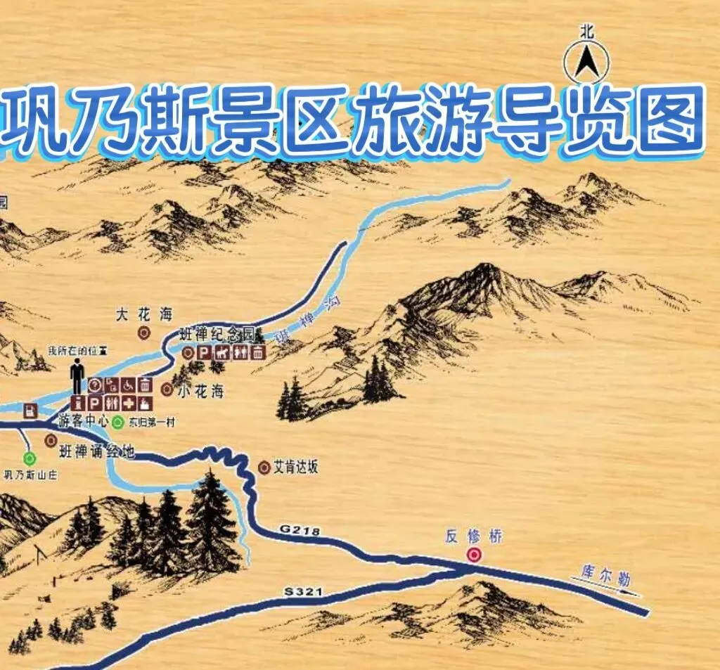 已在线办理好自驾票的游客,可直接沿路线图指引入园:地图搜索“巩乃斯景区(大门)”,沿指引绿色箭头行驶,从林场主干道在景区大门售票处前核验后,继续沿绿色箭头驶入景区即可。