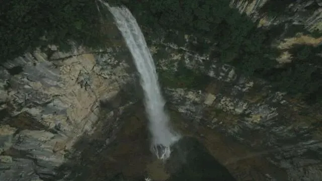 恩施大峡谷的深山绝壁上,有一条“特立独行”的瀑布,它能“倒”着流。这条瀑布叫作码料溪瀑布,遇到强对流天气时会出现水倒流的情况,宛如大峡谷上空吸水,又像是重力反转,形成了一道水墙,非常壮观。