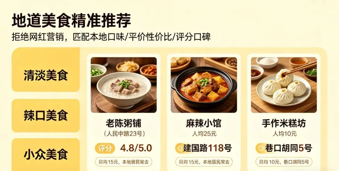 拒绝网红营销套路,结合本地人口味、平价性价比、评分口碑,推荐地道老店、特色小吃,标注人均消费和位置,想吃清淡、辣口、小众美食都能精准匹配。