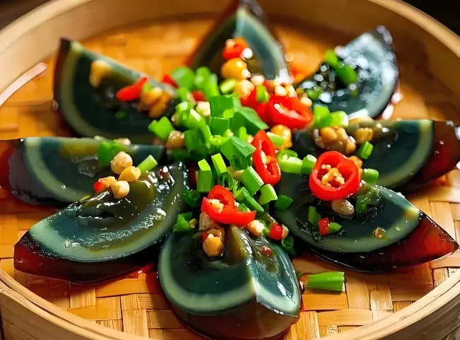 第三美食,麻洋糖心皮蛋。这是湖北特产,蛋体褐色透明,松花纹状,蛋黄软而不散,像糖心一样。夏秋解暑,冬春温补。在陆羽故园门口就能买到非遗传承人做的,30元一个,晶莹剔透,看着就舍不得吃。