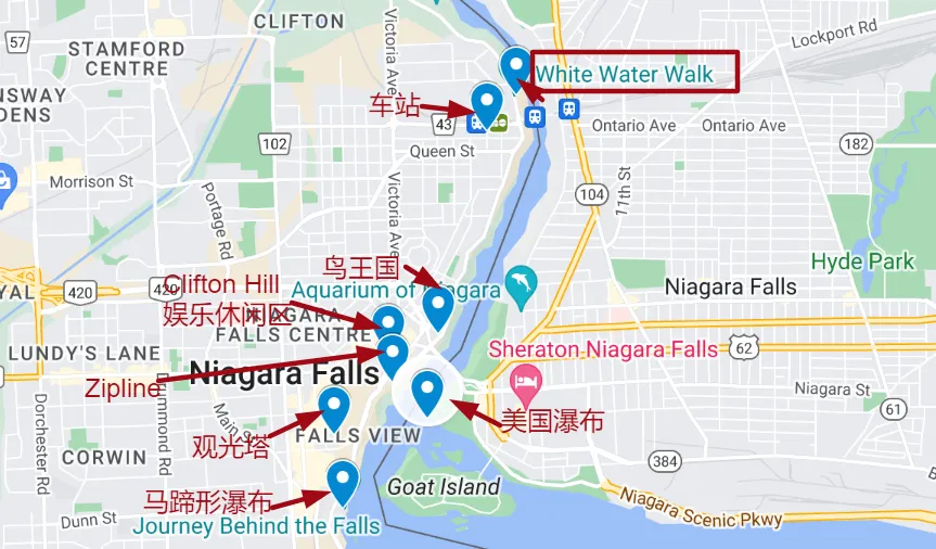 因为大瀑布的GO站距离大瀑布的马蹄形瀑布还有一段距离(4公里),步行至核心景区(Clifton Hill)约 30 分钟,走到马蹄瀑布约 50-60 分钟,不过一路也有不少景点(如下图所示),可以逛逛吃吃玩玩,不用非急着一下子赶到马蹄瀑布。