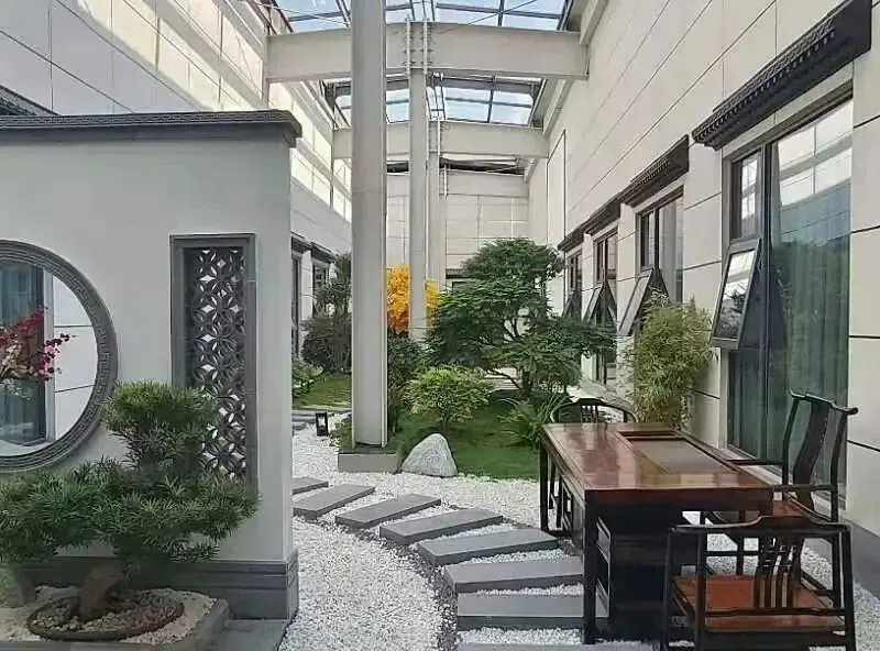 二层设有专属的客房区域,为您提供宁静舒适的休憩之所。而中庭更是别具匠心,采用了中式园林的设计概念。步入中庭,仿佛踏入了一个诗意的世界。亭台楼阁错落有致,假山怪石嶙峋奇趣,小桥流水潺潺作响。花木扶疏,绿意盎然,每一处景致都宛如一幅精美的画卷。在这里,您可以尽情感受江南园林的婉约之美,放松身心,享受宁静。无论是漫步其中,还是静坐赏景,都能让您沉浸在这独特的氛围中,为您打造一场难忘的视觉盛宴。