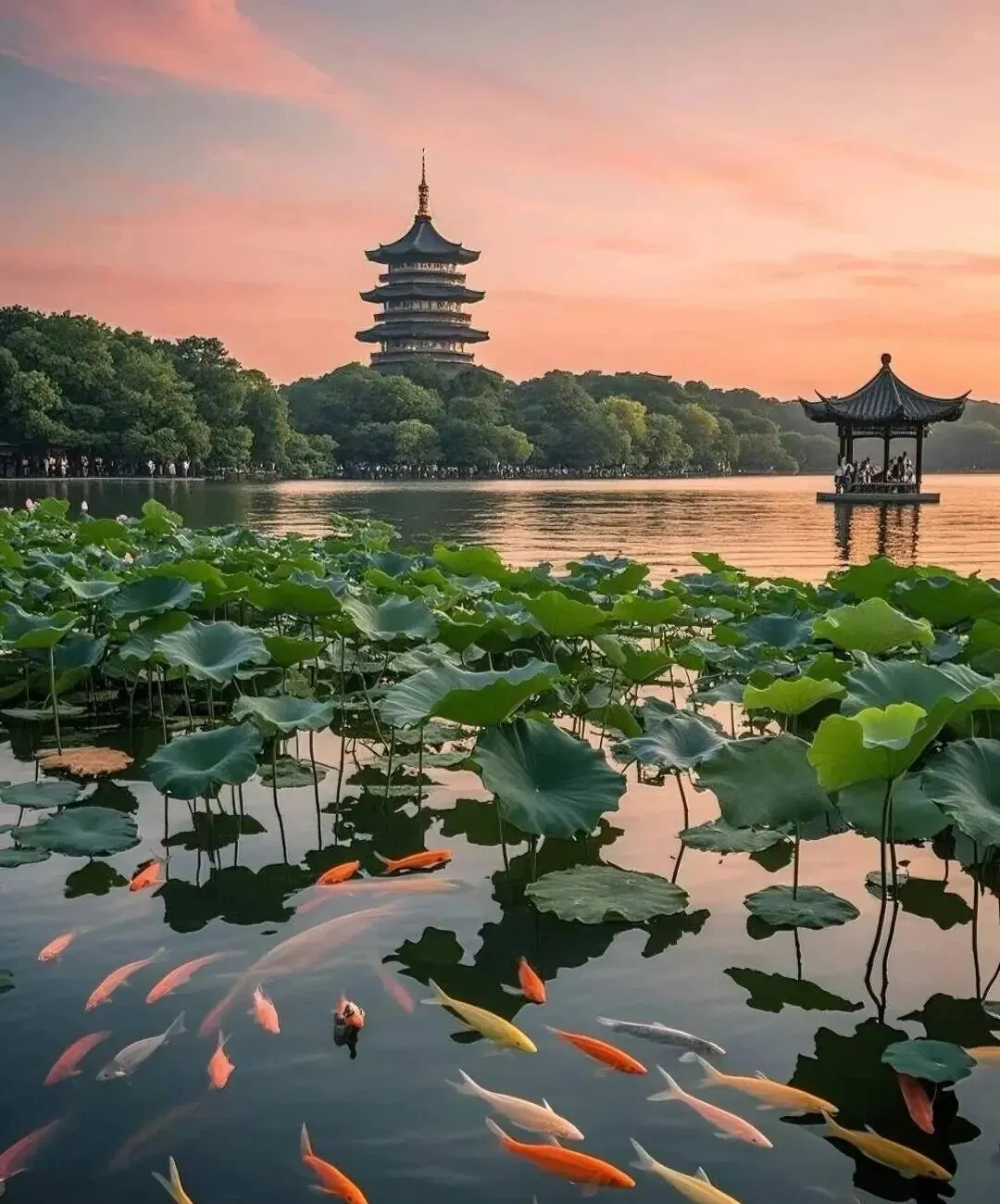 花港观鱼(无需门票) 花港观鱼位于西湖南面,苏堤入口附近。这里曾是一处私家宅院,因花家山的溪水经过流入西湖,所以被称作“花港”,是“西湖十景”之一。园中较出名的要数花港观鱼-红鱼池中成群结队的红鲤鱼,总有大人小孩拿饲料、面包屑给鱼儿喂食,不亦乐乎。