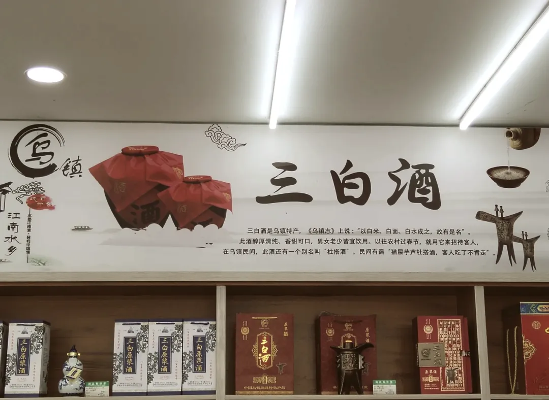 通安客栈中餐厅:三白酒三白酒是天然原料纯手工酿成。《乌青镇志》上说:“以白米、白面、白水成之,故有是名”。此酒醇厚清纯、香甜可口,入口绵甜、回味爽净、余香不绝。