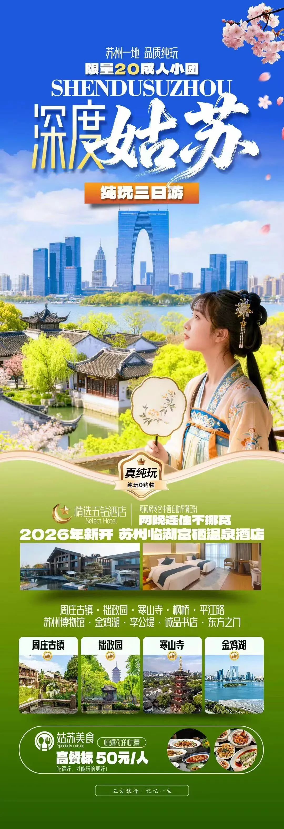 🧡深度苏州3日游 一车一导 不挪窝 25人小团 🔶5A景点,“中国第一水乡”-周庄,以其灵秀的水乡风貌,独特的人文景观,质朴的民俗风情,成为东方文化的瑰宝。 🕌苏州拙政园:圆拱门成为最美的点缀,这就是苏式美学。 🌇苏州平江路千年古韵与现代繁华交融的人间烟火 ,漫步在苏州古城,仿佛穿越千年时光,领略江南水乡的风情万种。 🌈苏州博物馆现有藏品四万余件,以出土文物、明清书画和古代工艺品为馆藏特色,包揽了众多“吴地遗珍”,是一座最能体现吴地文化的藏馆。 ☄打卡网红大裤衩-东方之门,结合现代与古典风格 🏢精选苏州两晚5钻豪华型酒店,享精致酒店自助早餐,住的舒适、安心。 🥂姑苏美食 ,含特色餐,高餐标50元/人,品苏州风味。 🚌土著带团,优选导游,一车到底,本地人玩法,匠心良品。