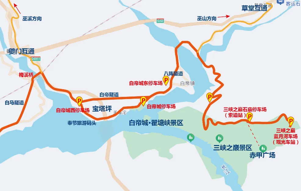 📍白帝城·瞿塘峡:首选“白帝城停车场”(景区内,最便捷)白帝城东/西停车场可免费乘坐摆渡车至白帝城停车场(仅限黄金节假日)📍三峡之巅:推荐“石庙停车场”(近索道入口)蓝月河上行往巫山机场方向可沿途停车索道限流时(每日限额3000人)可乘坐内部交通车至赤甲广场