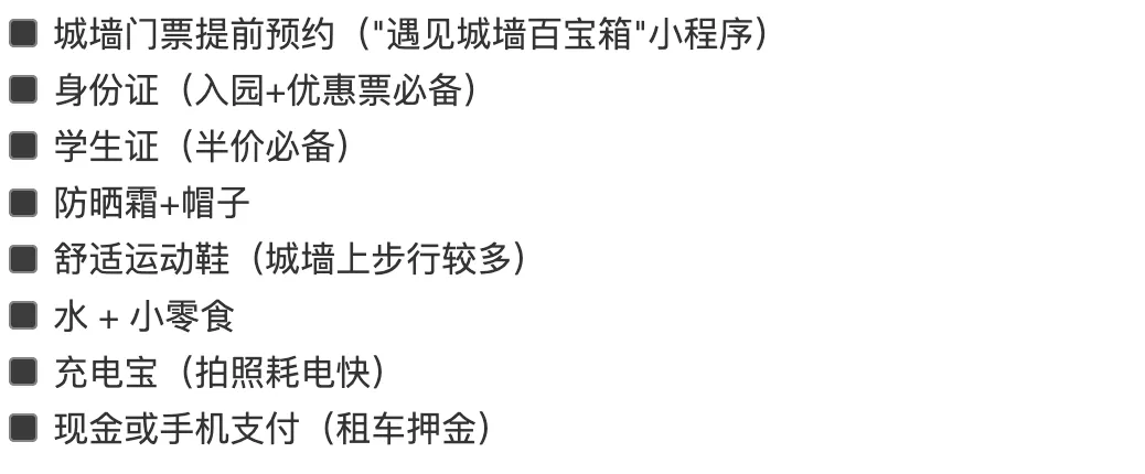 ⚠️ 城墙禁止携带个人自行车,只能租赁景区自行车。2小时足够骑完一圈,超时按规则补费。