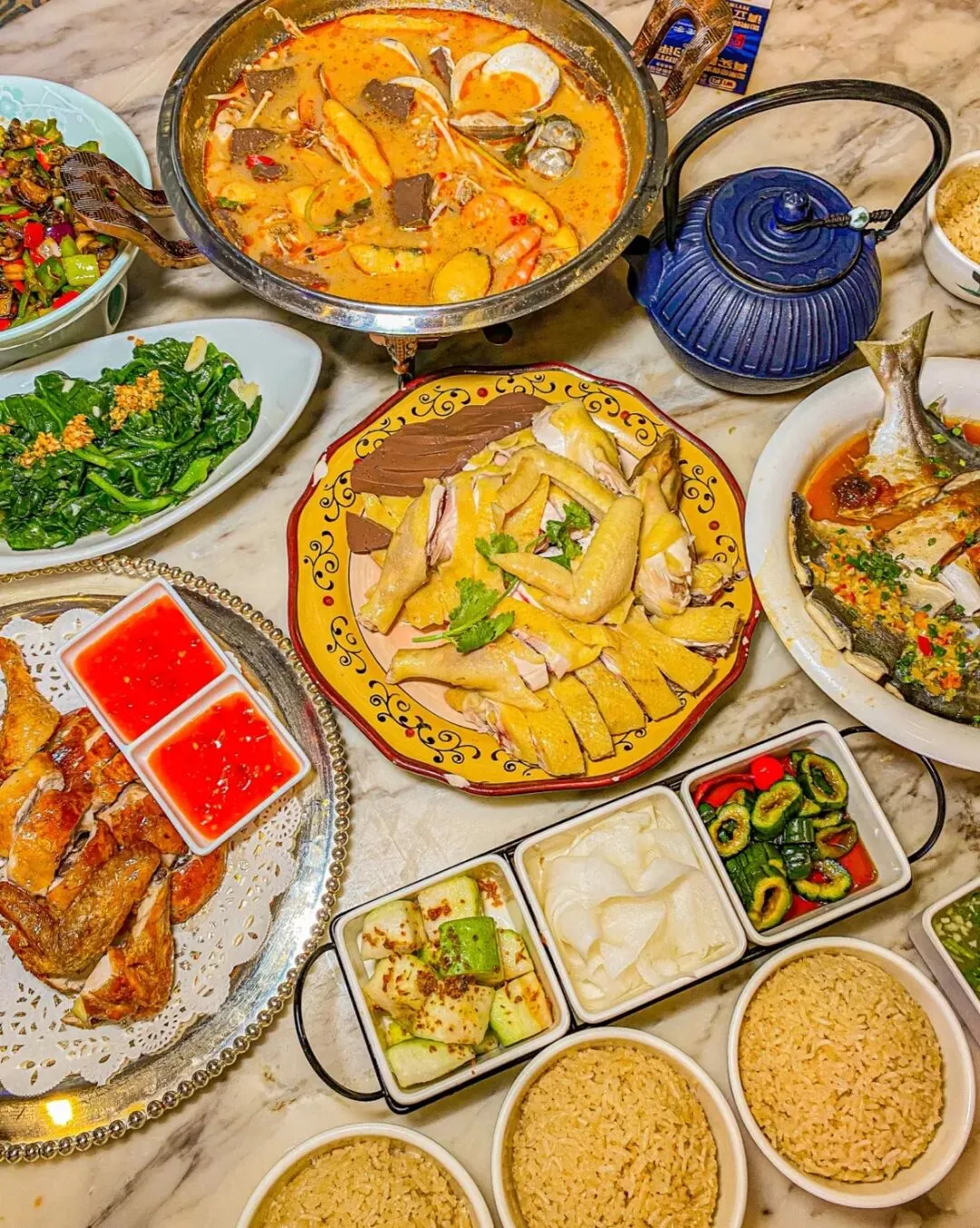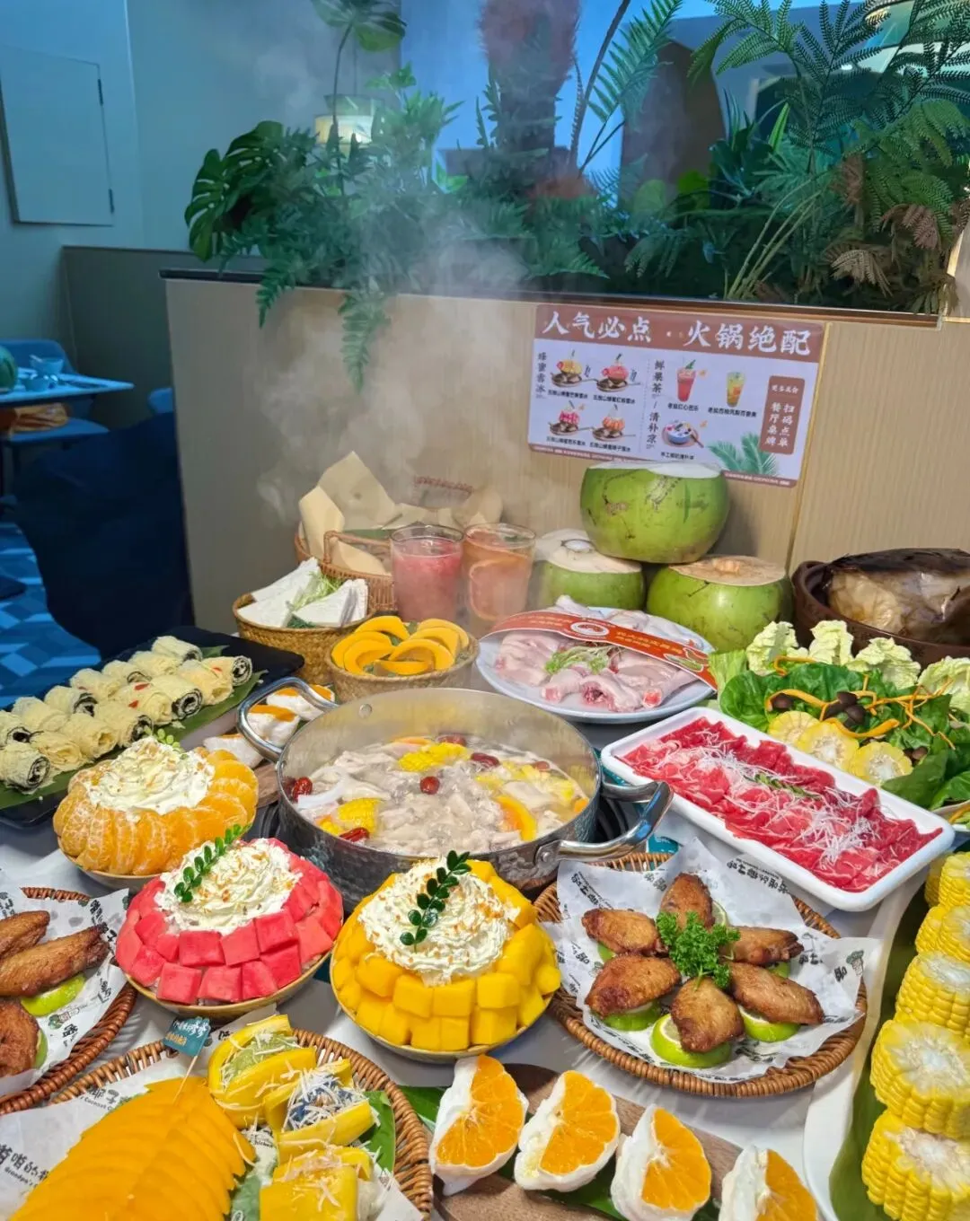 椰子锅清甜,鸡肉嫩滑,蘸料灵魂,水果甜品也超绝。