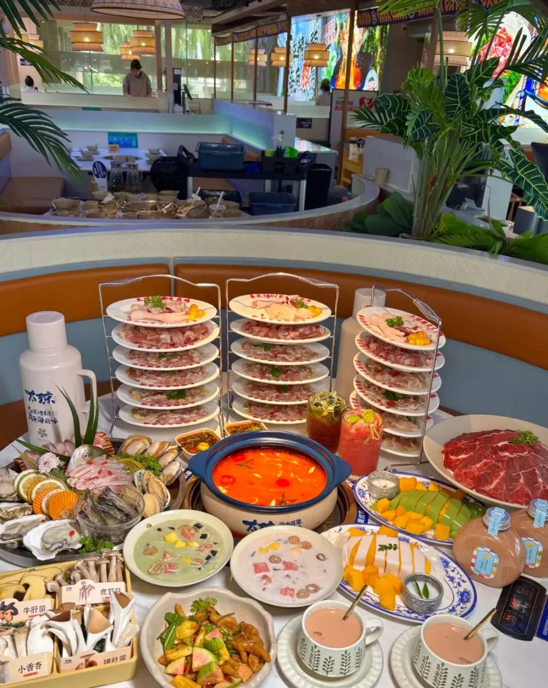 鸳鸯锅底,酸辣开胃,椰香清甜,鸡肉嫩滑,海鲜现捞。