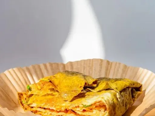 天津早餐 “灵魂”,地道做法用绿豆面摊饼,磕鸡蛋、撒葱花,卷果篦儿或果子,刷甜面酱、腐乳,外软内脆,豆香与酱香浓郁。