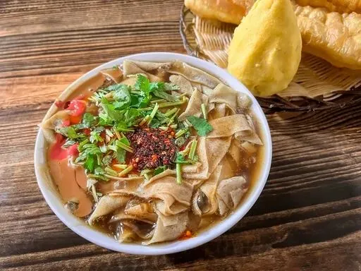 天津特色早点,绿豆面摊成的锅巴切条,浇咸香卤汁,配腐乳、辣子、香菜,滑嫩入味,咸鲜爽口。