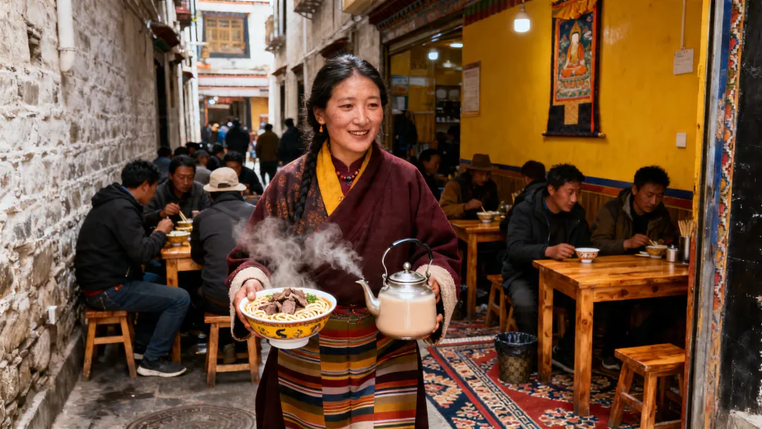 很多游客会跟风打卡网红藏餐店,但这类门店不仅价格偏高,口味也并不正宗,本地人几乎不会光顾。想要吃到最地道的藏式风味,不如钻进老城区的小巷子:现熬的酥油茶咸香劲道,藏面筋道入味,牦牛肉鲜嫩不柴,藏香菇焖煮得喷香扑鼻,价格实惠又充满烟火气,一口就能尝到最真实的西藏日常。