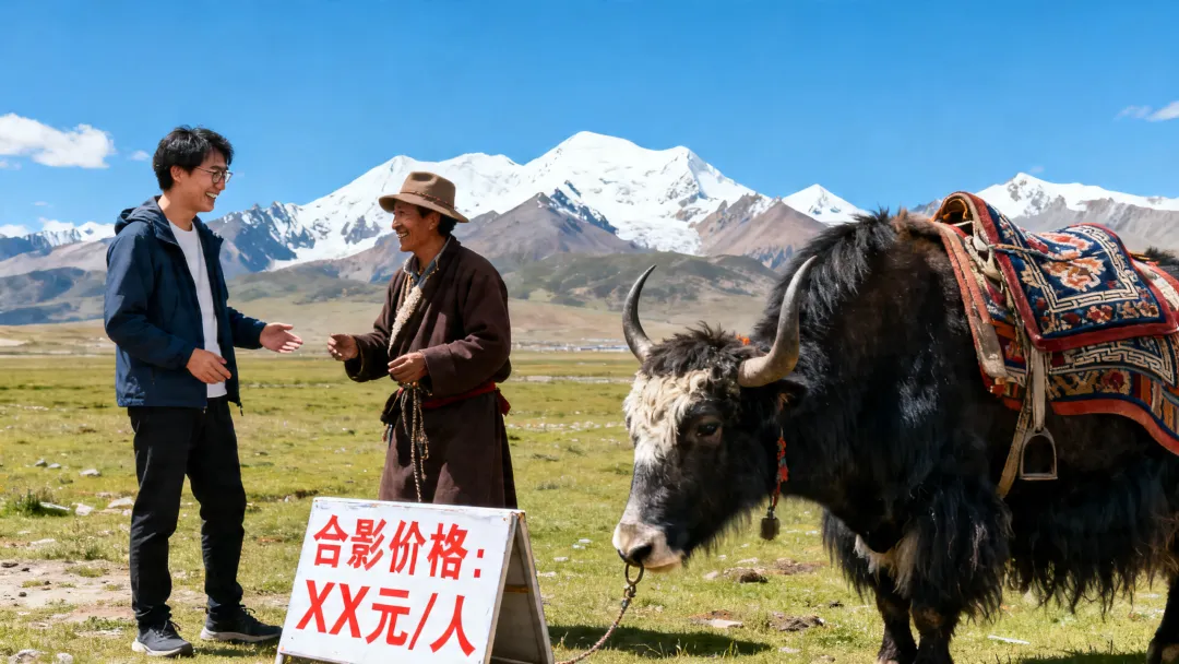在羊卓雍措、纳木错等热门景区门口,常有牦牛、藏獒供游客合影留念。一定要提前问清楚收费标准:是按单人收费还是按动物头数收费,避免拍完照被坐地起价——比如原本说好的10元/人,结账时变成50元/头,到时有理也说不清。