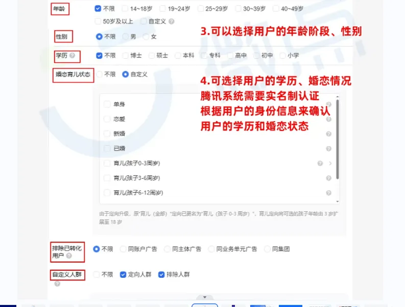 受众画像筛选:圈定目标用户的年龄区间、性别、受教育程度、婚恋育儿状况等标签;同时设定广告在线时段,如每日早7点至晚24点,该时段通常是目标群体浏览朋友圈的高频时间。