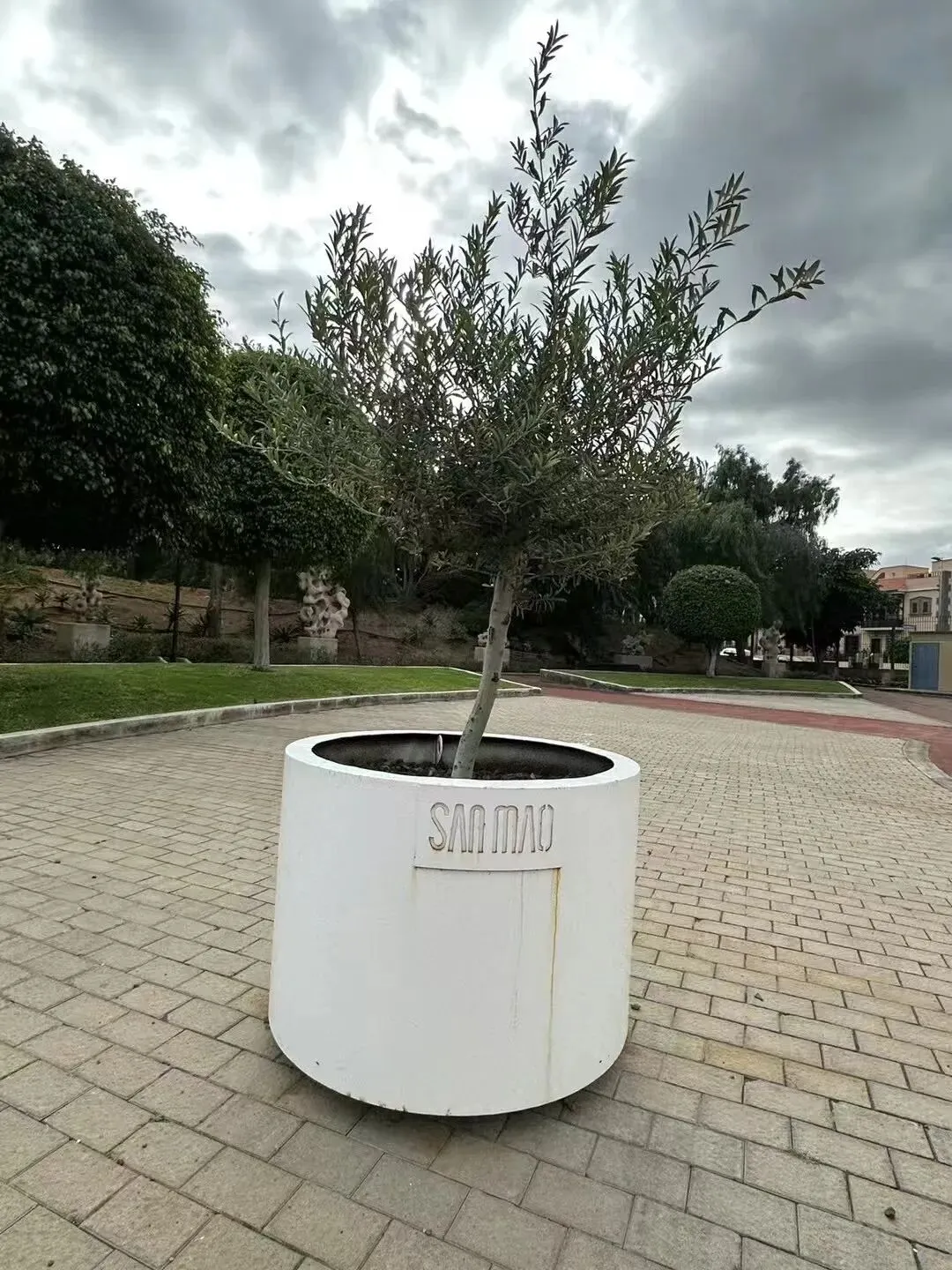 这里是后来市政部门建设的纪念三毛的花园,位于当地著名的公园圣璜公园(Parque San Juan)里面,三毛花园里有以她的西班牙文书《加纳利的日记》的形状做的长椅,有她最爱的石头绘画(虽然觉得红色的石头画的好突兀),还有一棵橄榄树,种植在一个写着SANMAO大型花盆里,当然值得去打卡一下。