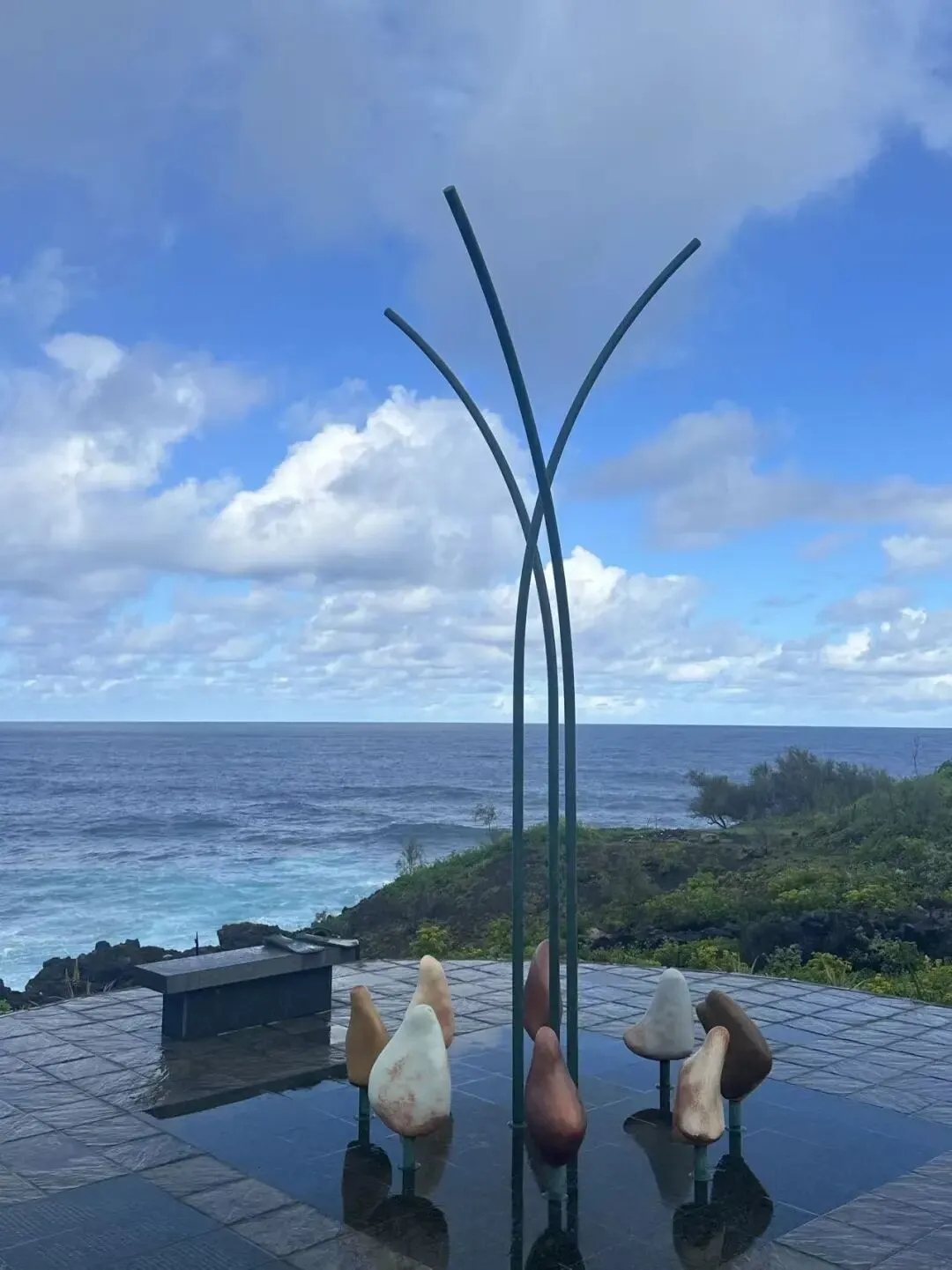 这里位于拉帕尔玛岛的最北端,是一片满是浪涛的海滩,这里是荷西1979年9月30日潜水遇难的地方,如今已经设计成一个纪念广场。主题是三根柱子的艺术品,地面上有三毛的诗歌,有中、西、英、德四种文字的介绍。石凳上的潜水镜和脚蹼是根据荷西的私人物品1:1复制的。此情此景海水呜咽,天地悲鸣,真不能想象三毛有多伤心和绝望。