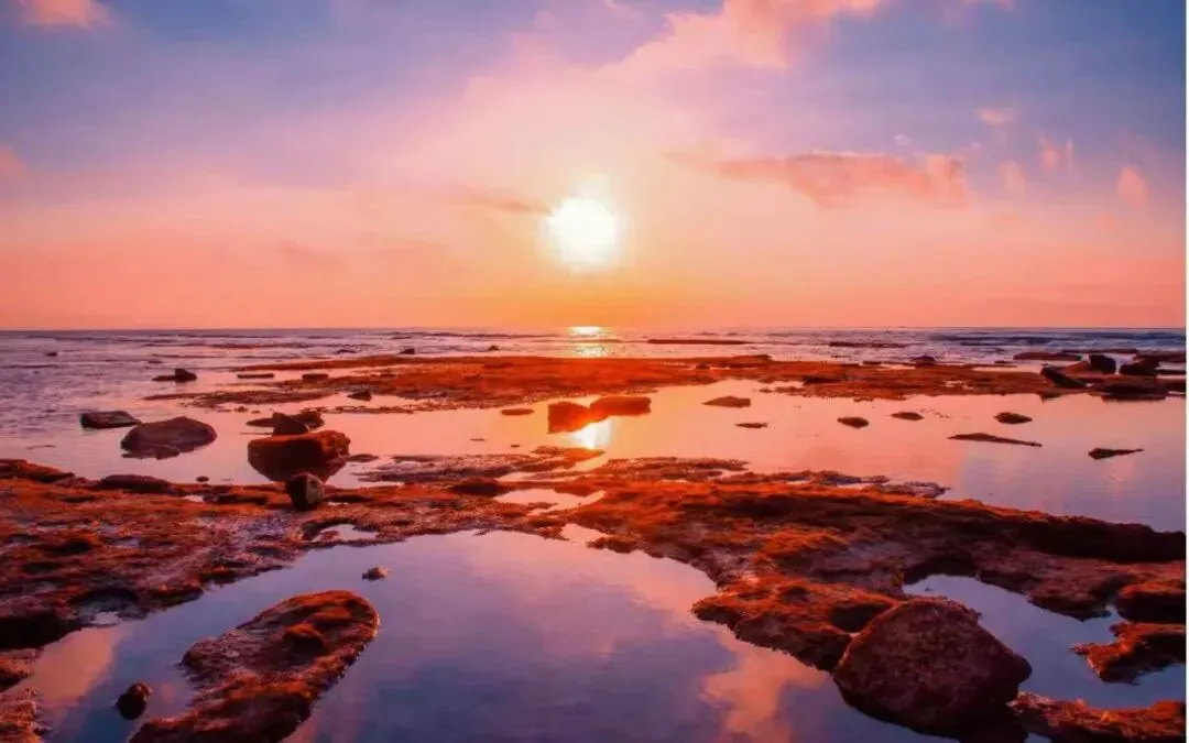 早上6点:去五彩滩看日出。退潮后,海滩上露出大片火山岩,在晨光下呈现出红、黄、绿、黑、白五种颜色,非常梦幻。一定要穿防滑的鞋子,火山岩很滑。我们的导游会提前查好当天的日出时间和潮汐表,确保客人不会白跑一趟。