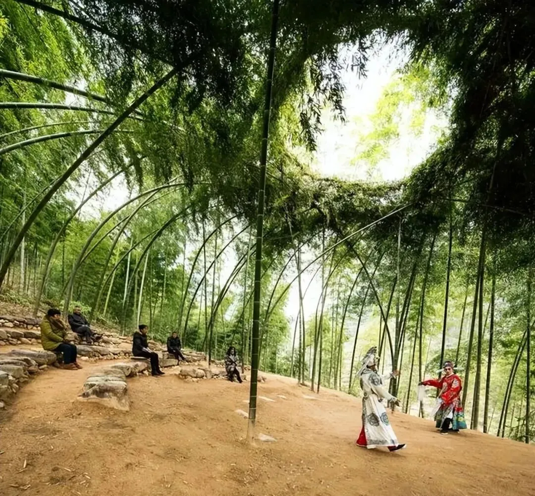 "毛竹园"并非正式地名,实指横坑村竹林剧场,由建筑师徐甜甜于2015年设计,利用生长中的毛竹下拉围合成天然穹顶状休憩空间[12]。竹子每年更替,结构动态演化,被称为"有生命的新陈代谢体",可用于祭祀、演出或露营冥想。
