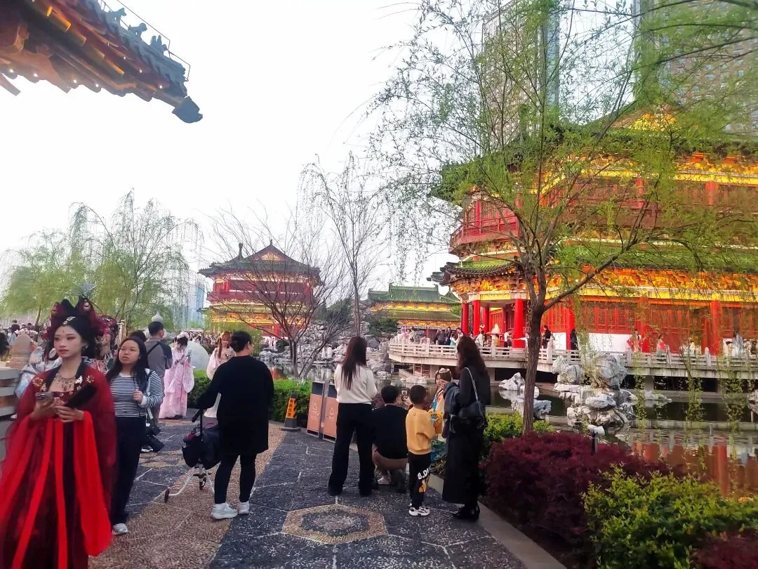 这里是开放式的,白天晚上都可以来。晚上园林也有漂亮的灯光,看起来就像是不夜的大唐。