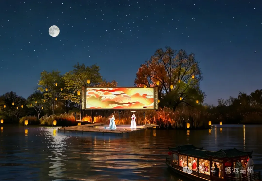 活动内容:依托涡河水岸风光,升级画舫游船、河岸光影亮化、水幕光影秀与建安国风演艺。乘舟漫游,尽览亳州夜色,灯光映水、星河落河,串联亳州历史文脉,打造船行画中、夜赏亳城的沉浸式夜游新体验。
