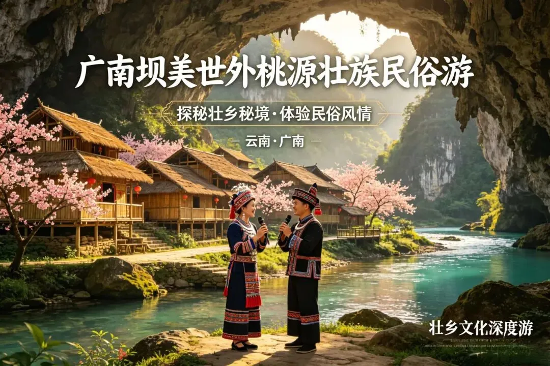 乘船穿溶洞、壮族歌舞表演、民族服饰换装、村寨山歌对唱、夜晚乡村篝火晚会