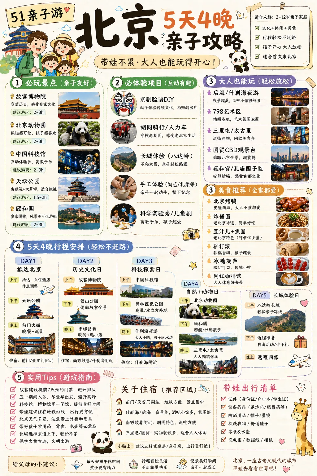 这张图出来的时候,我其实挺惊讶的。因为我什么细节都没说,只给了一句非常模糊的话,它却已经主动把很多亲子游该考虑的东西一起补进去了。 1 它知道亲子游不能太赶,行程要相对轻松 2 推荐的景点和美食,都明显偏向适合带孩子 3 它还顺手把一些需要提前预约的点提醒出来了 4 甚至把出行清单和每天路线都一起整理出来了 这张图最让我意外的,不是“它会做攻略”,而是的文字排版、插图都非常的完整 但这版当然也不是完全没问题。亲子游虽然是以小孩为主,但成年人也还是需要有一些属于自己的项目。 我说 需要有一些适合成年人的项目