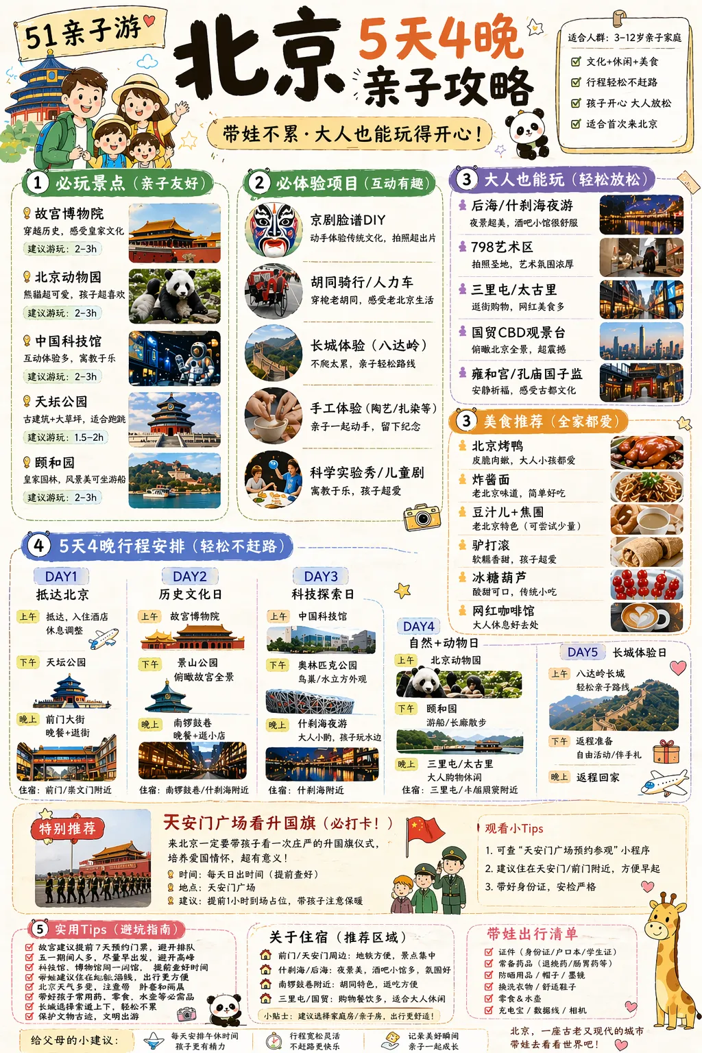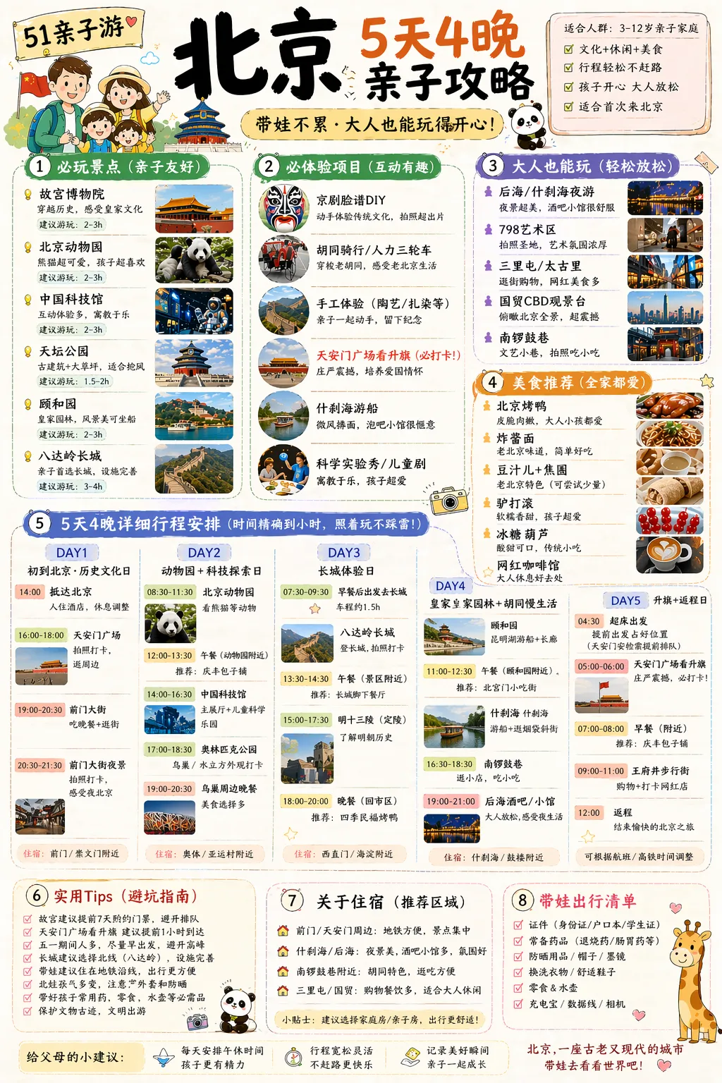 GPT-image-2:做五一旅游攻略的版本答案五一小长假马上到了,不少朋友已经提前把攻略做完了,毕竟很多酒店不提前订,临近节假日是真订不到。但我相信,也还有不少人和我一样,到处搜攻略,收藏了一堆,最后还是没决定好到底去哪、怎么玩。 做一份完整的旅游攻略,其实很费精力。路线要规划,酒店要挑,美食要筛,景点值不值得去、哪些要预约、每天怎么走才不累,这些都得提前想清楚。 刚好最近 GPT 的最新图片模型全量上线了,我试了一下:让它直接给我做一份五一旅游攻略。 我说 51 小长假北京 5 天 4 晚亲子游