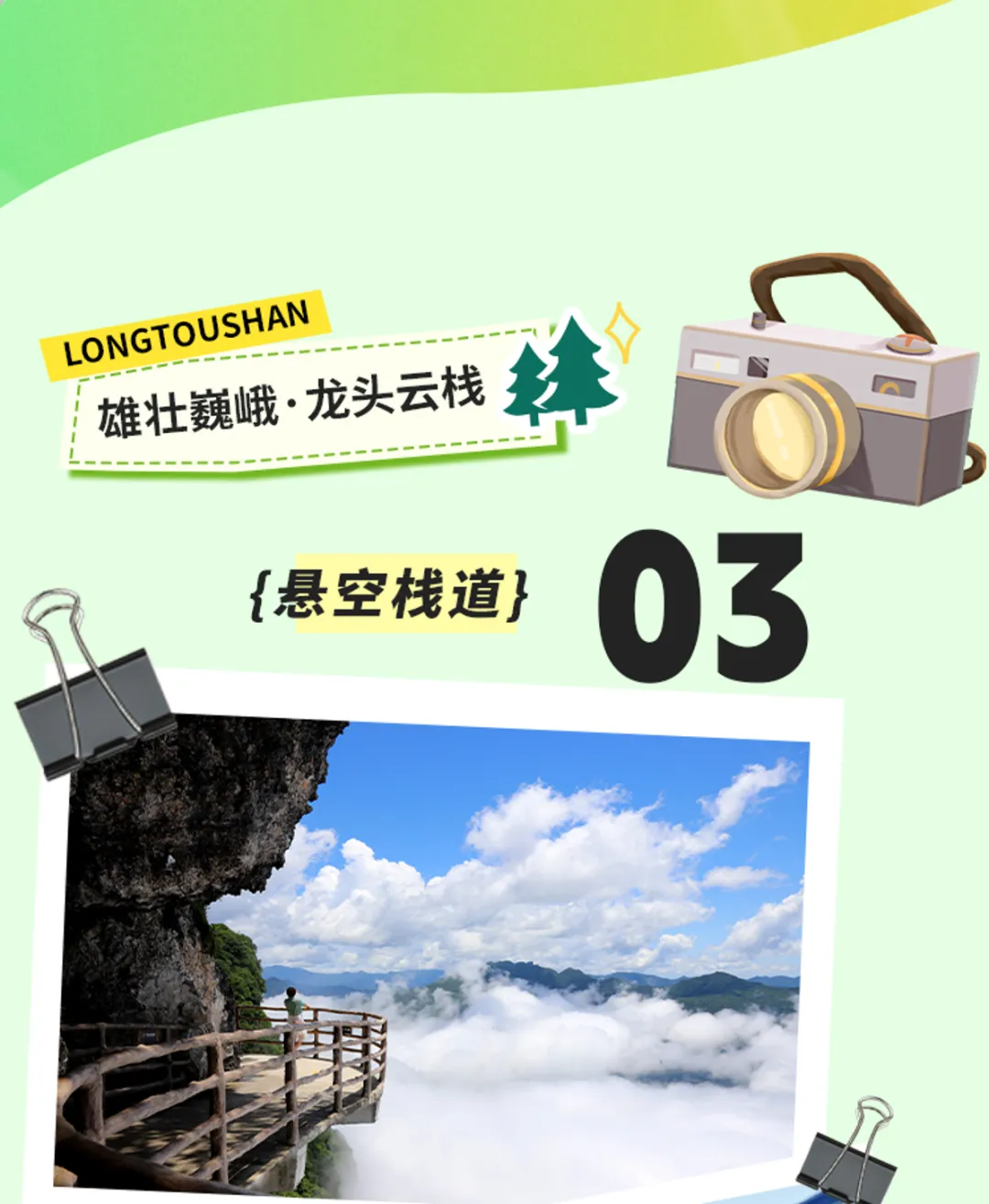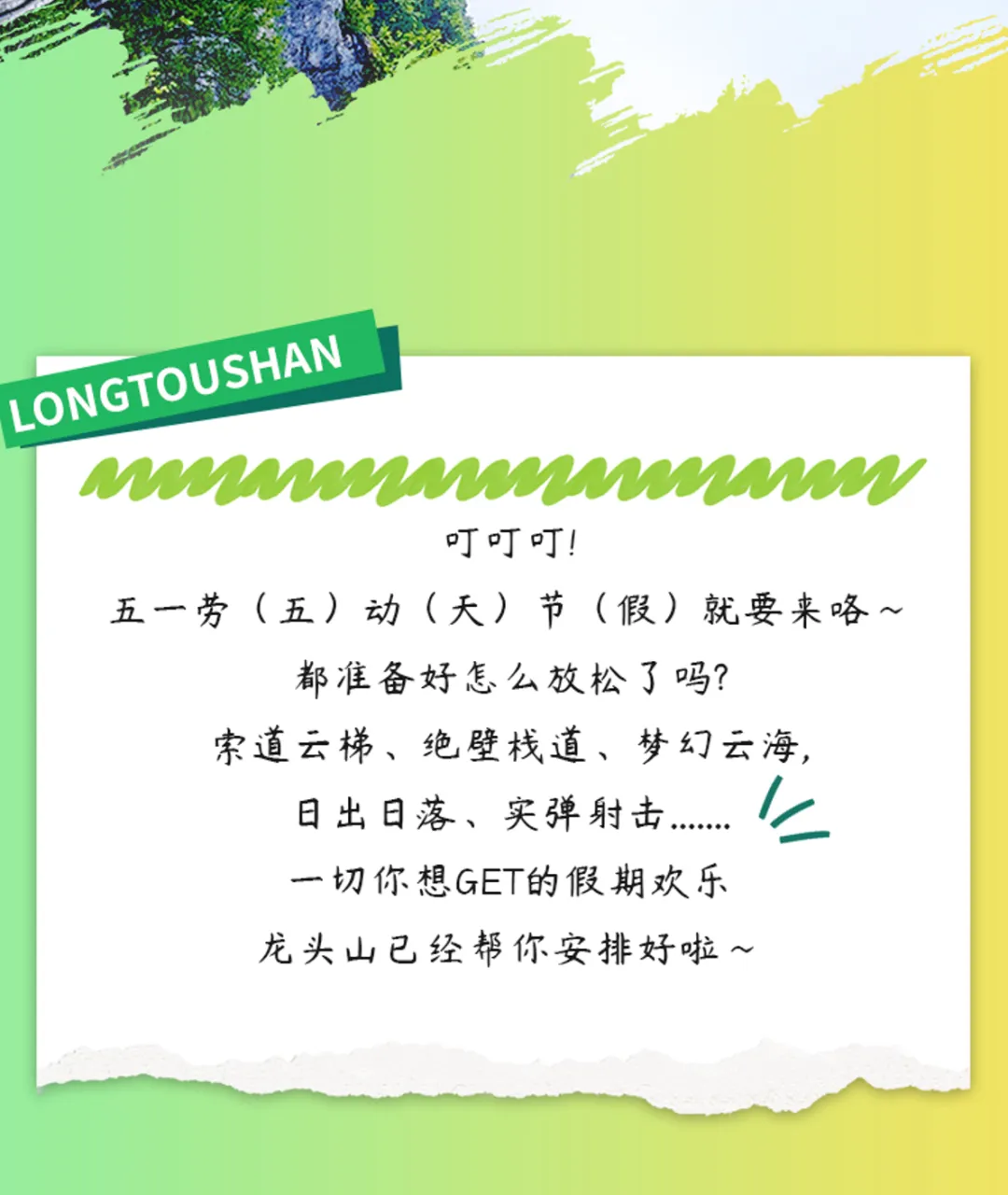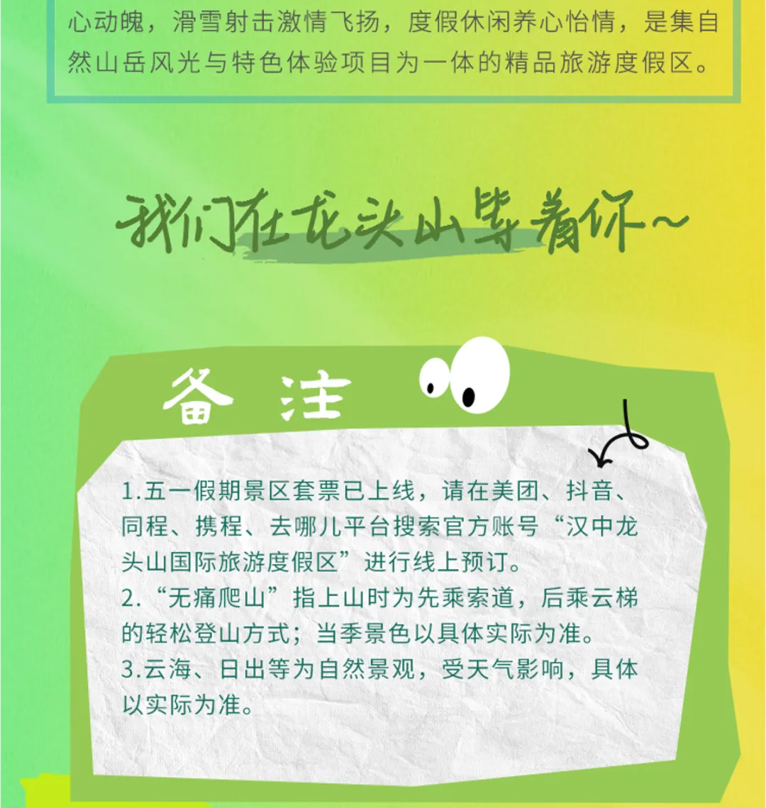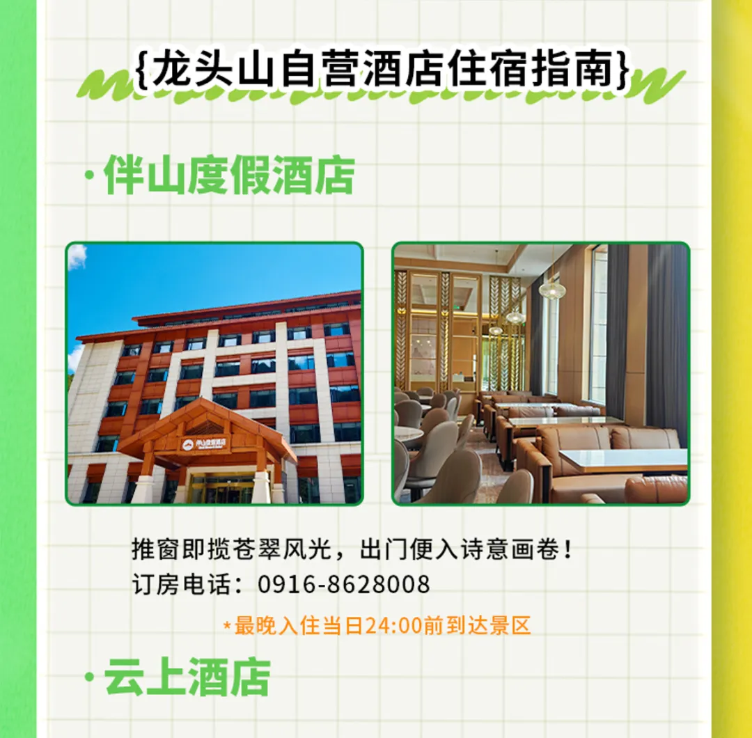 文字、编辑丨张婷婷 2.售票时间:游客中心观景套票15:30停售;射击建议17:30前购票入场。 3.云梯、玻璃栈道为免费体验项目,若因雨雪等极端特殊天气或项目日常维护未能开放时,敬请谅解。请勿穿着高跟鞋游览玻璃栈道!请勿使用坚硬物品摩擦划伤玻璃!请勿在玻璃栈道上蹦跳或摇晃护栏!玻璃栈道冬季不开放! 5.景区禁止携带宠物入园,请提前安顿好您的爱宠。 6.现开放景点、项目及区域:天索、云梯、龙头云栈、龙头山滑雪场(夏露营冬滑雪)、射击场。当季风光与自然天气有关,以实际为准;禁止前往未开放区域,否则后果自负。 7.山地气候多变,建议自备外套和雨具。天气预报动态请移步龙头山官方微博了解详情。 8.请选择正规渠道购票或订房,了解购票或订房的详细信息,谨防上当受骗。