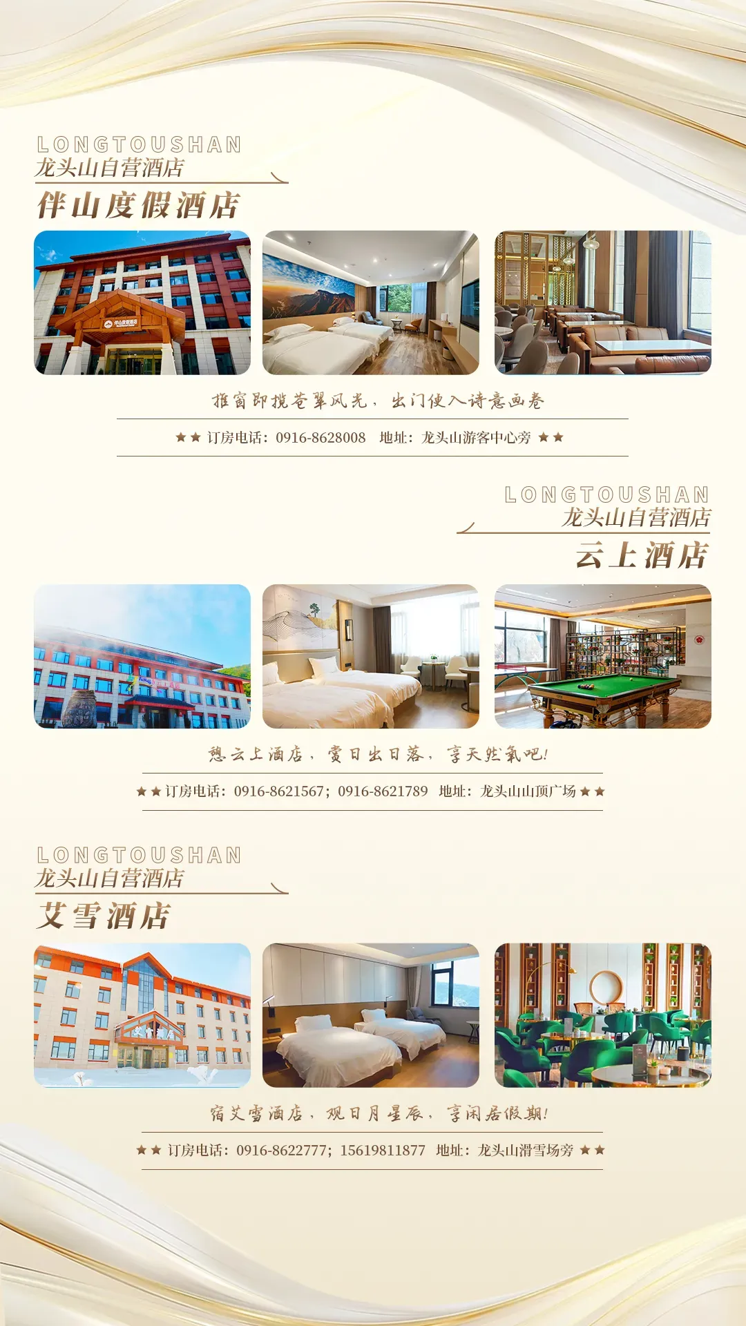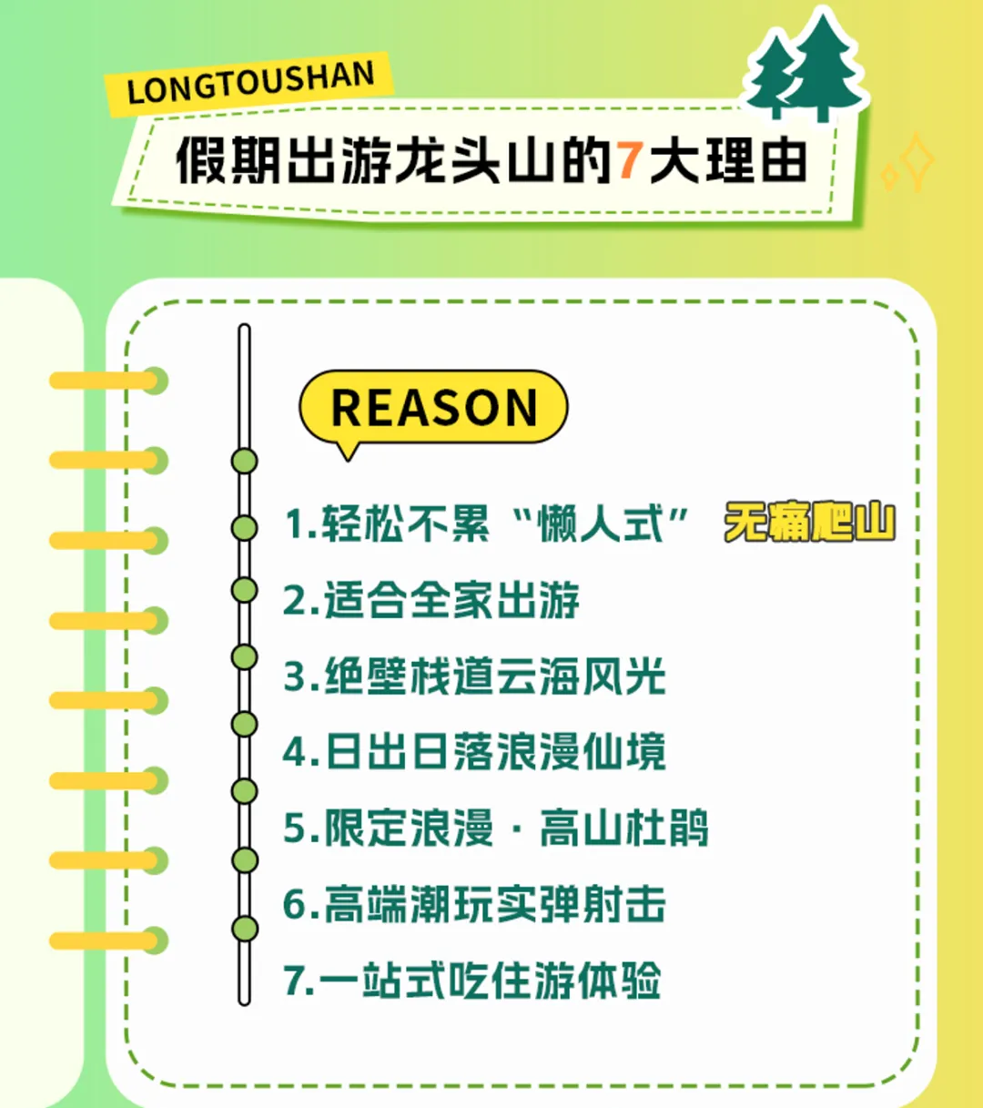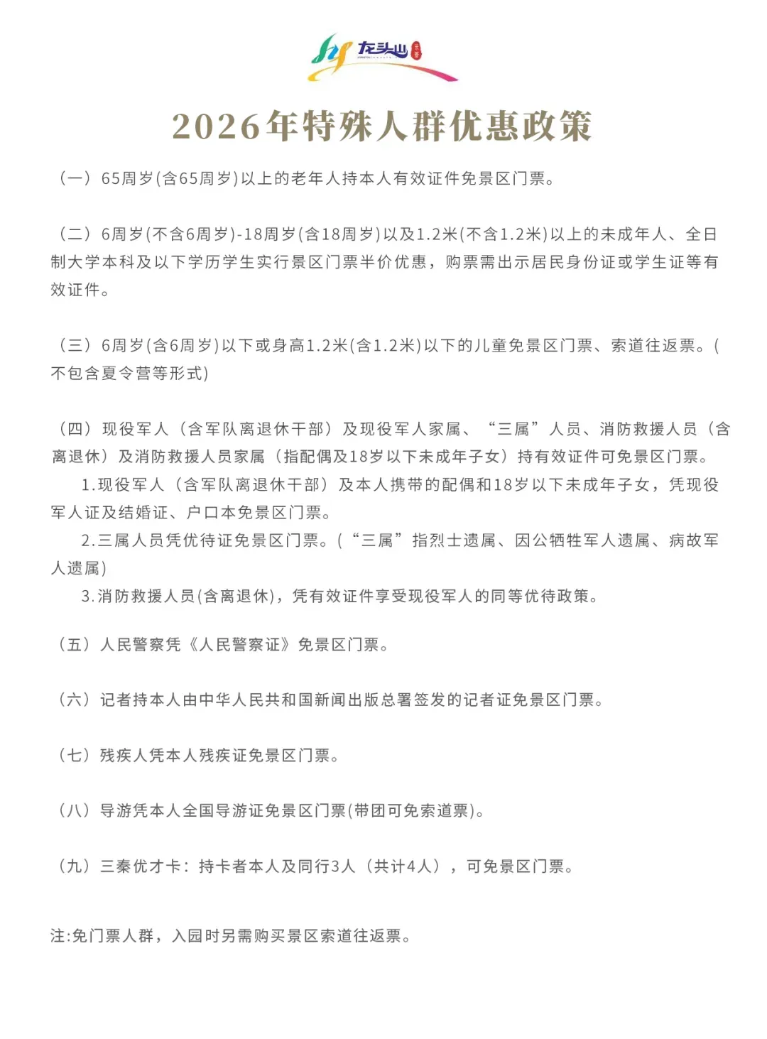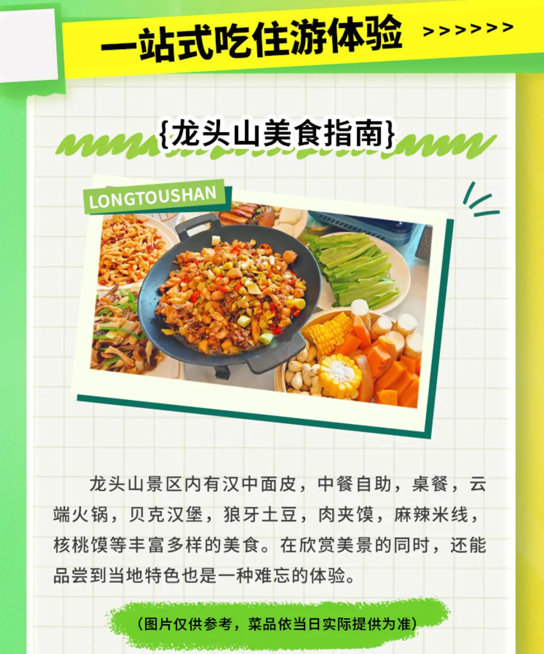 文字、编辑丨张婷婷 2.售票时间:游客中心观景套票15:30停售;射击建议17:30前购票入场。 3.云梯、玻璃栈道为免费体验项目,若因雨雪等极端特殊天气或项目日常维护未能开放时,敬请谅解。请勿穿着高跟鞋游览玻璃栈道!请勿使用坚硬物品摩擦划伤玻璃!请勿在玻璃栈道上蹦跳或摇晃护栏!玻璃栈道冬季不开放! 5.景区禁止携带宠物入园,请提前安顿好您的爱宠。 6.现开放景点、项目及区域:天索、云梯、龙头云栈、龙头山滑雪场(夏露营冬滑雪)、射击场。当季风光与自然天气有关,以实际为准;禁止前往未开放区域,否则后果自负。 7.山地气候多变,建议自备外套和雨具。天气预报动态请移步龙头山官方微博了解详情。 8.请选择正规渠道购票或订房,了解购票或订房的详细信息,谨防上当受骗。